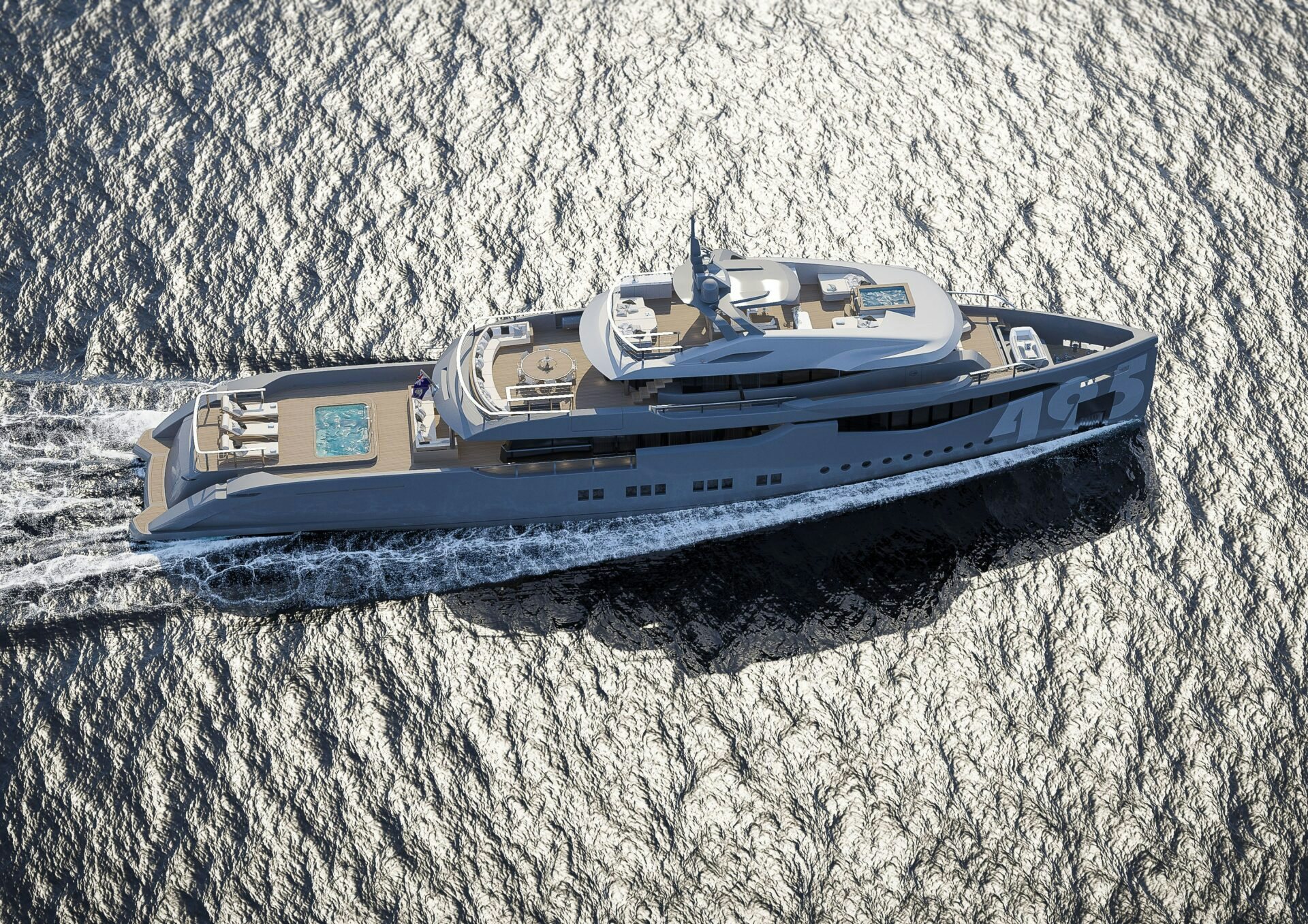 Superyacht RMK 5000 EVO EXPLORER boasts an ultra-luxurious modern exterior. Offering the interior volume and exterior deck space of a much larger yacht, RMK 5000 EVO EXPLORER showcases four expansive decks offering endless options for owners’ and guests’ enjoyment. The superyacht provides exceptional outdoor living areas for lounging, soaking in the sun and alfresco dining. RMK 5000 EVO EXPLORER features a Jacuzzi on the sundeck where guests can take in the views of their destination. The yacht also has an expansive main deck aft with a pool — an excellent space for guest use — as well as a tender and toy garage allowing for a toy-free deck and plenty of in-water fun.