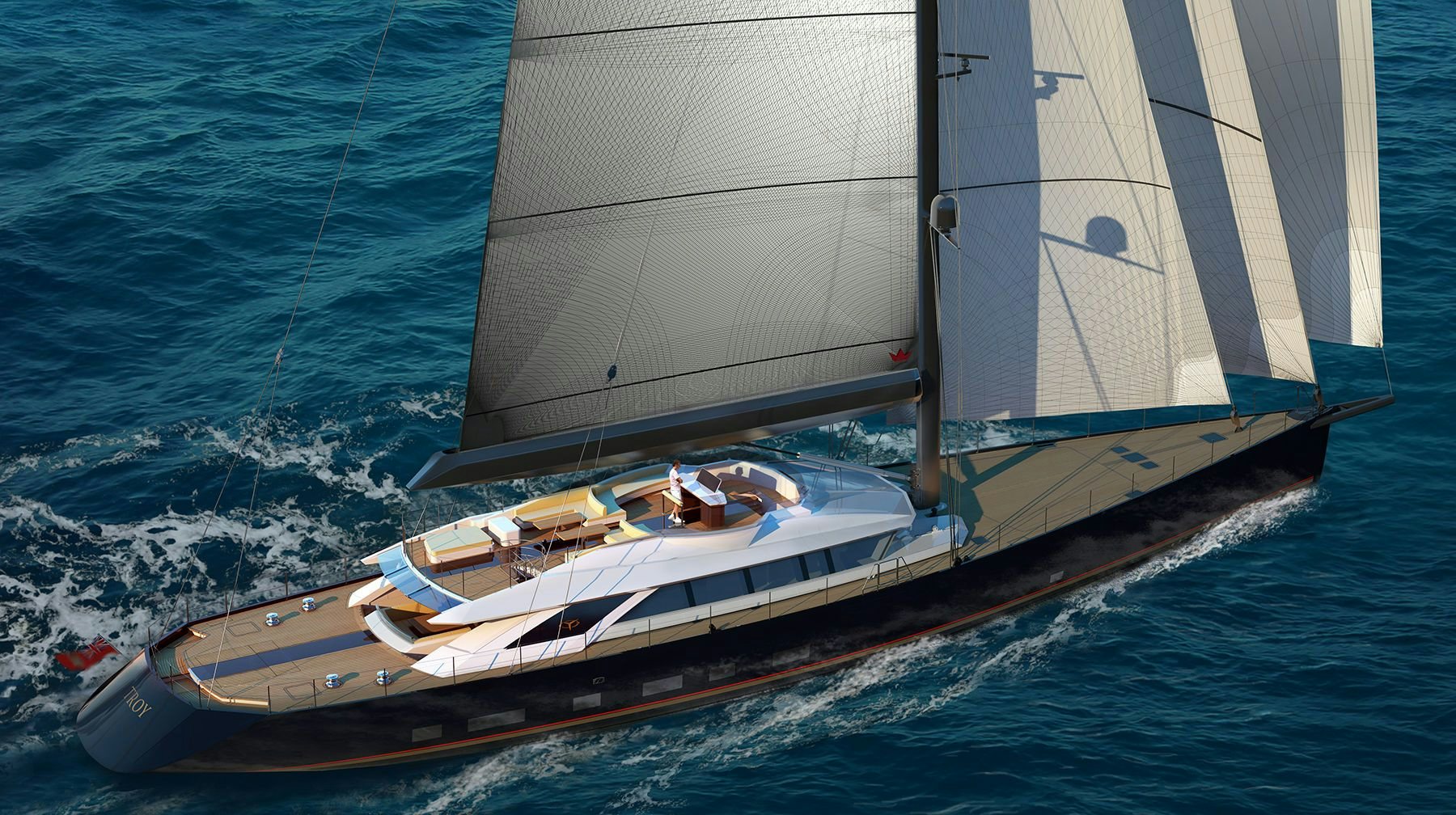 Designed by Tim Saunders with naval architecture by Dykstra, the impressive superyacht TROY is set for delivery in 2015. TROY is a beautifully designed sailing yacht boasting both impeccable styling and exceptional performance. TROY's exterior is elegantly contemporary, yet rugged and aggressive. A stunning glass-paneling feature, which runs from the private aft-deck Jacuzzi through the centerline of the yacht to the deck helm station, allows sunlight to filter into the interior, illuminating the onboard living spaces.