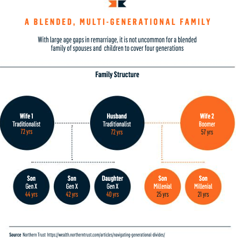 With large age gaps in remarriage, it is not uncommon for a blended family of spouses and children to cover four generations