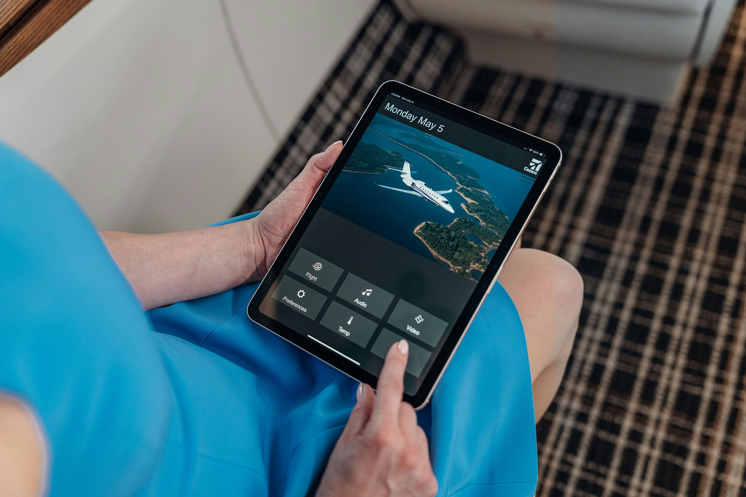 Before the engines even turn, you are connected. You connect to WiFi without a second thought, open your device, and the cabin management system makes the environment yours. Temperature. Lights. Music. Maps. All at your touch. The hum of preflight fades into the background, replaced by the kind of peace that only a well-designed space can deliver.