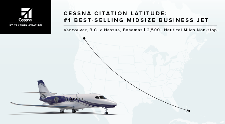 Wheels up. From Vancouver to the Bahamas, it is one long stretch of sky, and you are experiencing it nonstop. The Citation® Latitude® jet’s 2,700 nautical mile range quietly eliminates the need for compromise. And while the world rushes by 45,000 feet below, you stay grounded in comfort. A low cabin altitude of just 5,950 feet means your body feels rested, your mind clear. Whether you are headed toward palm trees or boardrooms, you arrive ready.