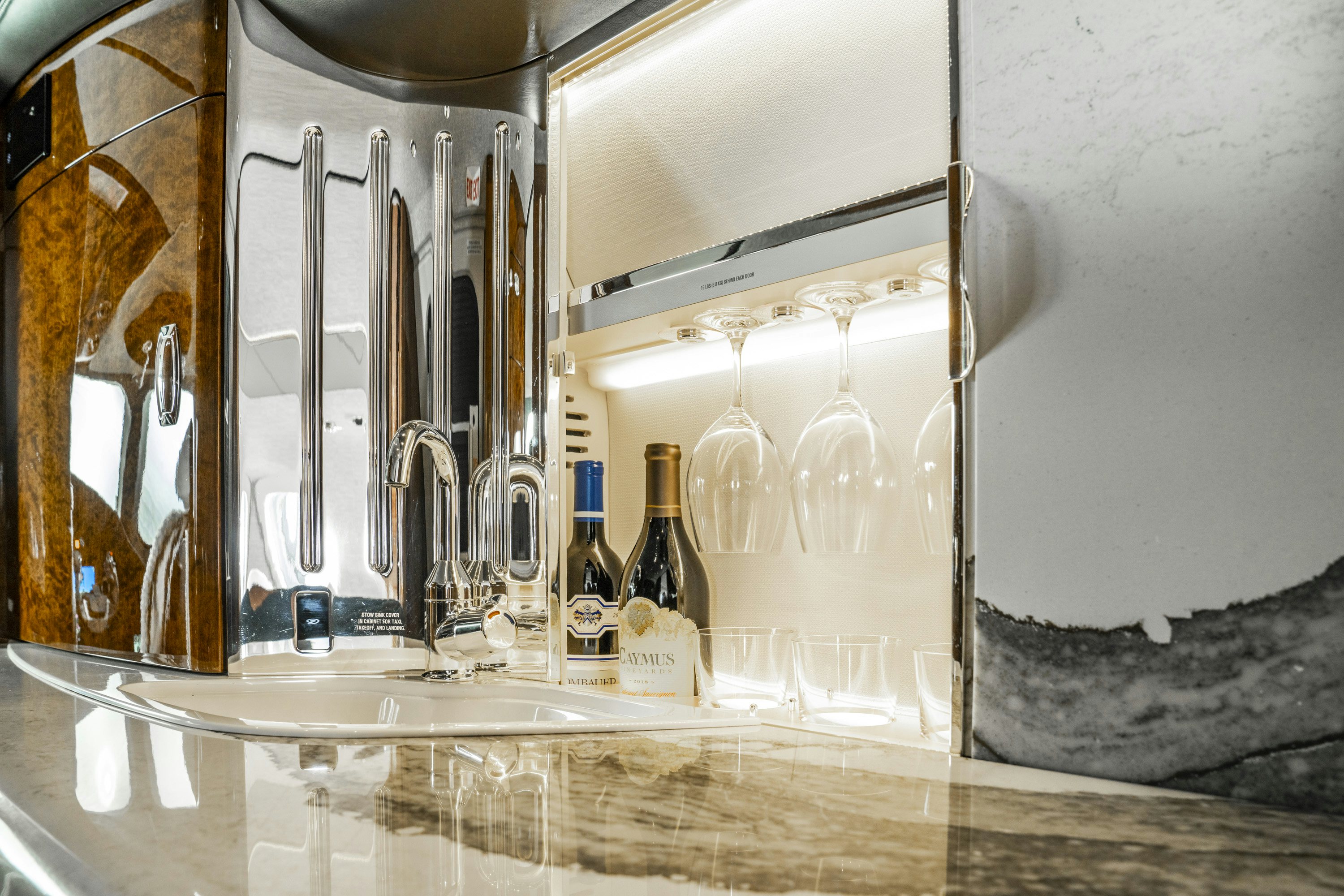 Luxury and practicality meet seamlessly throughout the cabin. The Longitude® jet features the largest wet galley in its class, complete with fine hardwood finishes, a high-capacity potable water tank, and space for optional appliances like a microwave or convection oven. In-flight dining becomes simple and sophisticated. A walk-in baggage compartment, accessible during flight, offers ample storage for up to one thousand pounds of luggage and gear.