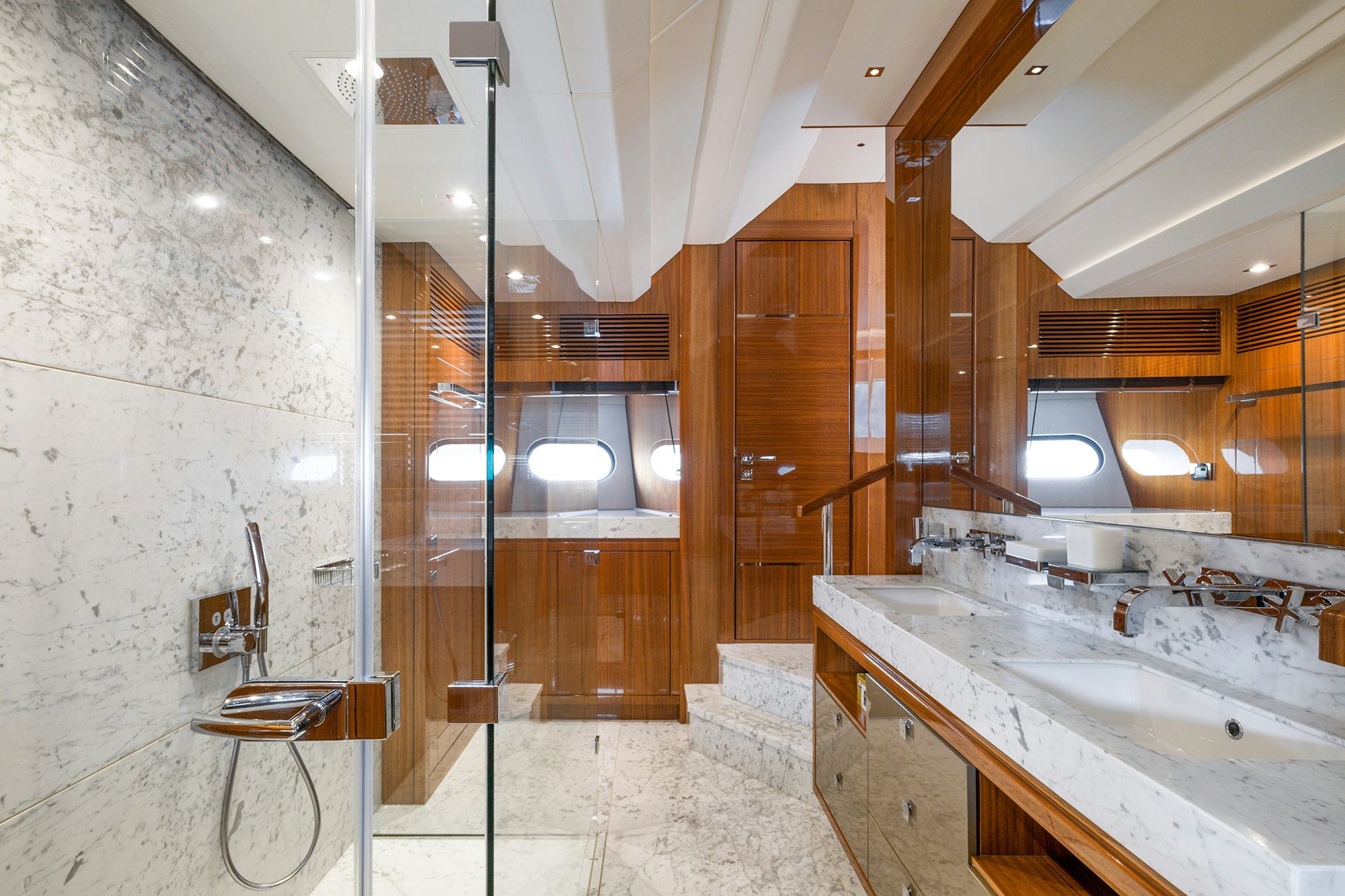 The owner’s suite is another area where buyers tend to pause. Located forward on the main deck, it delivers uninterrupted sea views through floor-to-ceiling glass and cutaway bulwarks. Two walk-in wardrobes and a standout open-plan ensuite with heated marble floors and a central rainfall shower underline that this yacht was built for owners who planned to spend real time onboard, not just weekend hops.