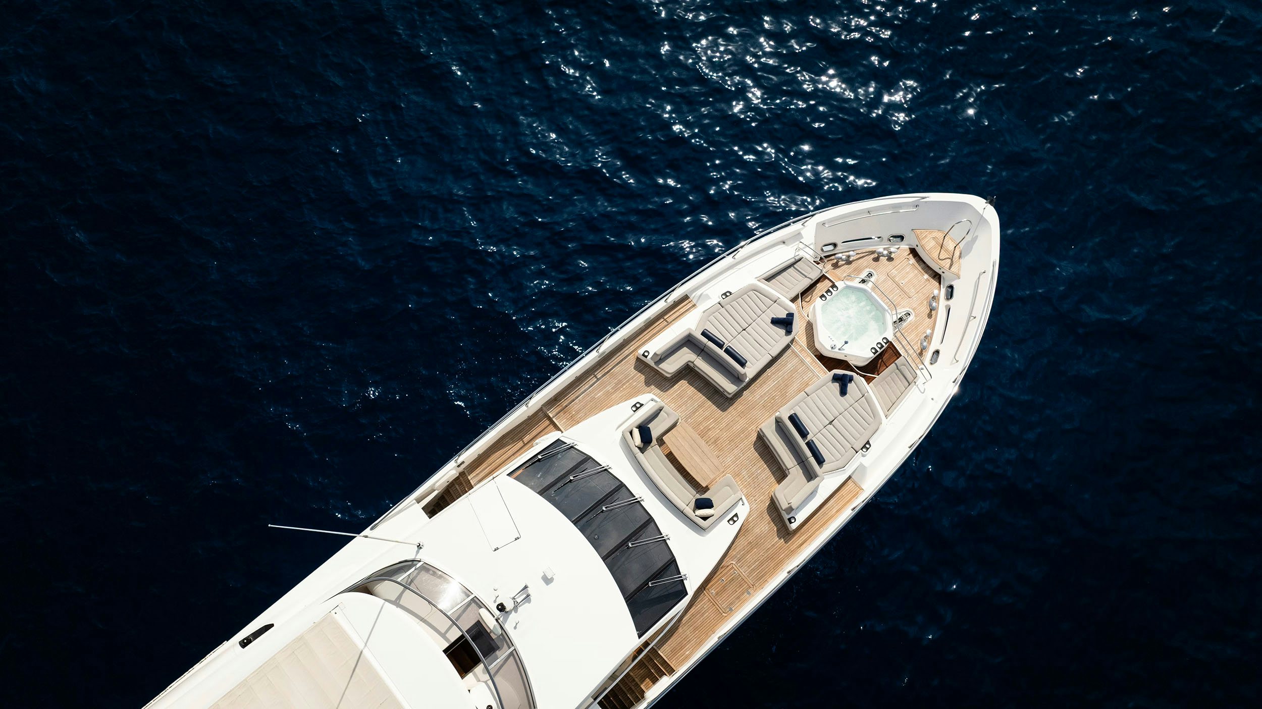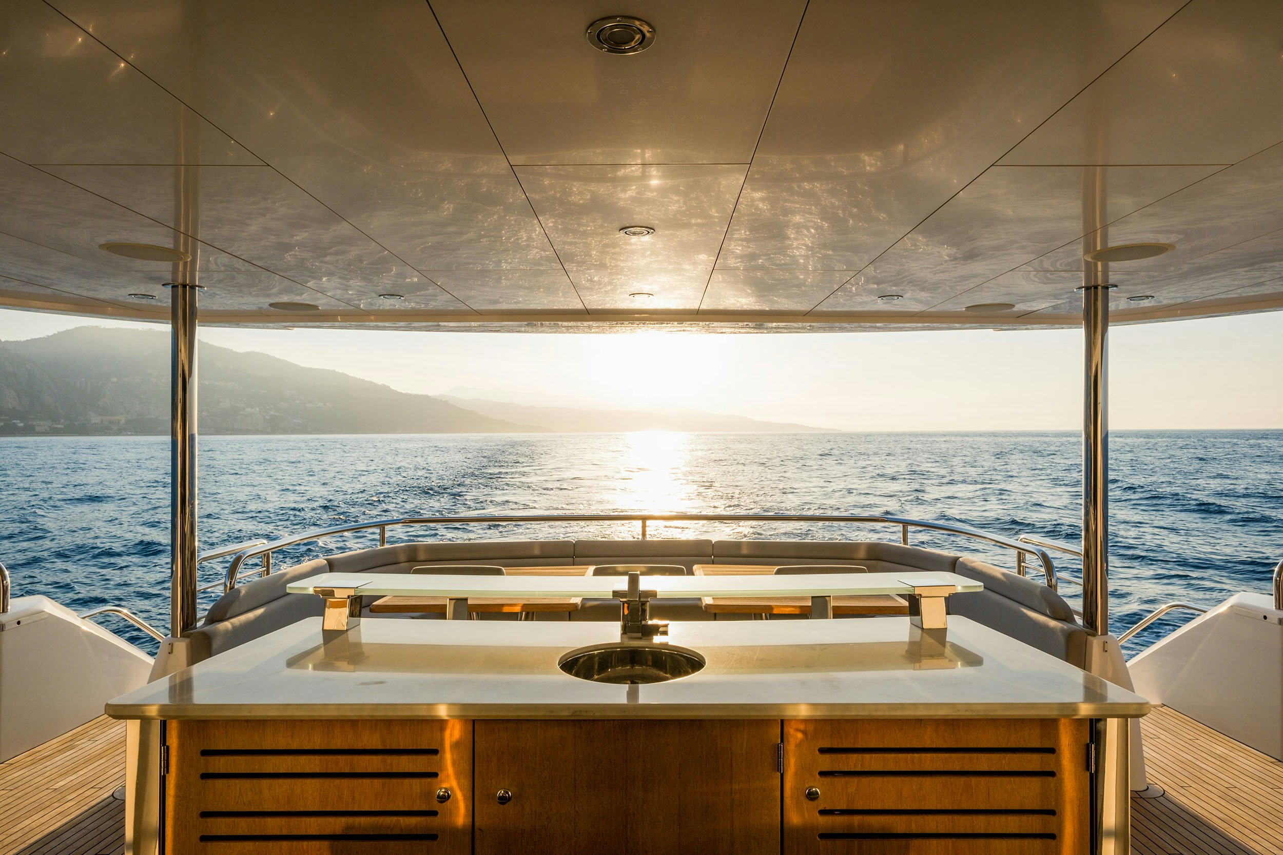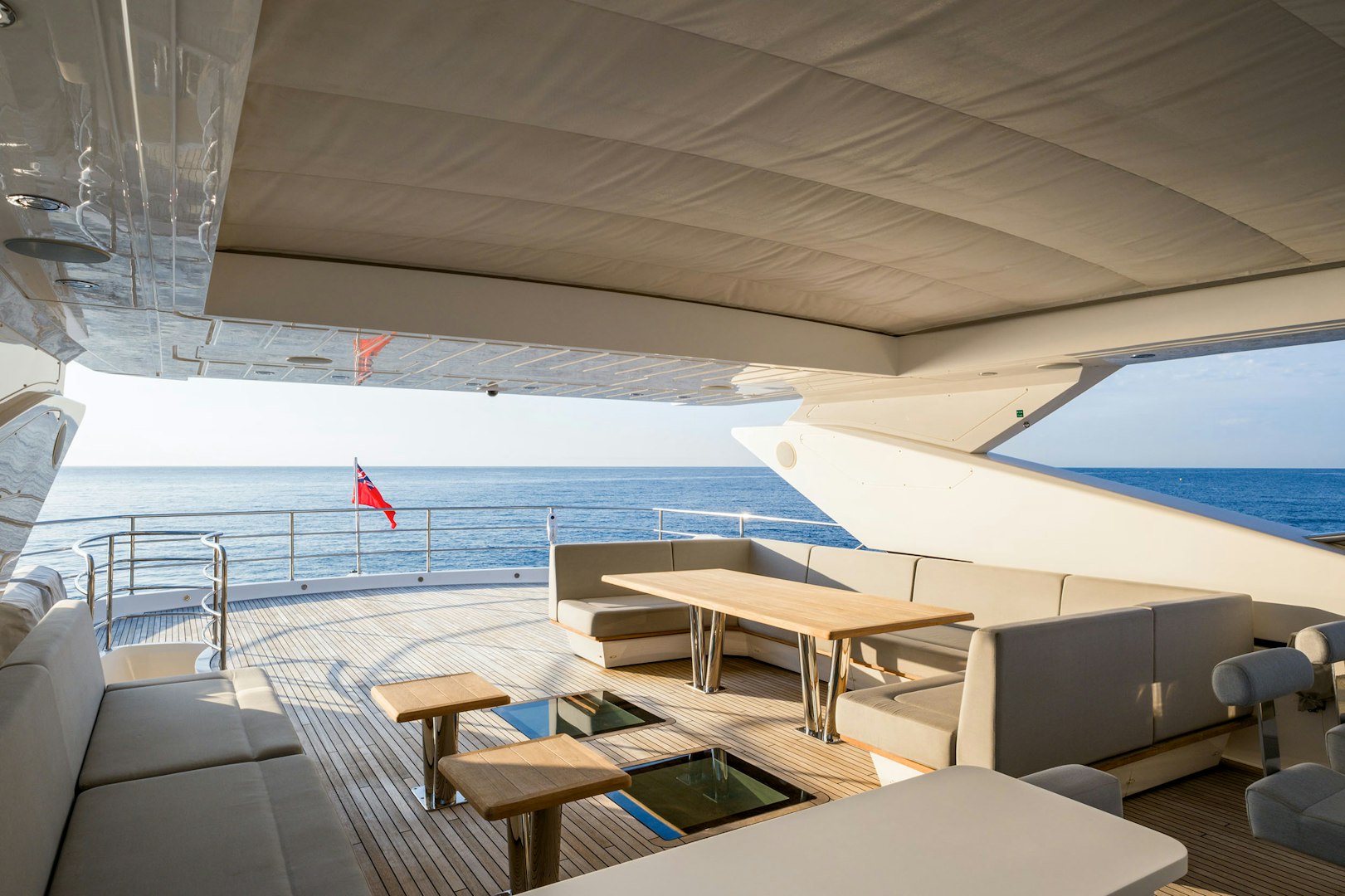 Outside, the yacht plays to her Mediterranean brief. The aft deck centres around a bar that links directly to the main salon and swim platform. The flybridge is expansive, with a second bar, dining, sun loungers and a retractable sunshade. Forward, the foredeck spa terrace is a genuine highlight. It’s private, sheltered, and ideal whether in port or at anchor.