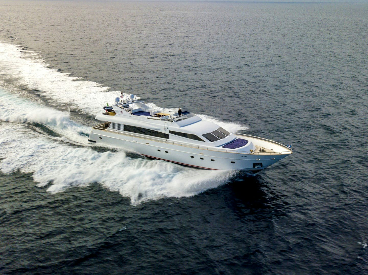 The yacht’s stylish interior is Italian styling at its best. Providing a relaxed, informal ambiance, CROWBRIDGE’s interior is adorned with beautiful Cherry wood and plush dark blue leather upholstery. The motor yacht’s open main salon that freely flows to the formal dining is perfect for unwinding as well as hosting dinner parties.