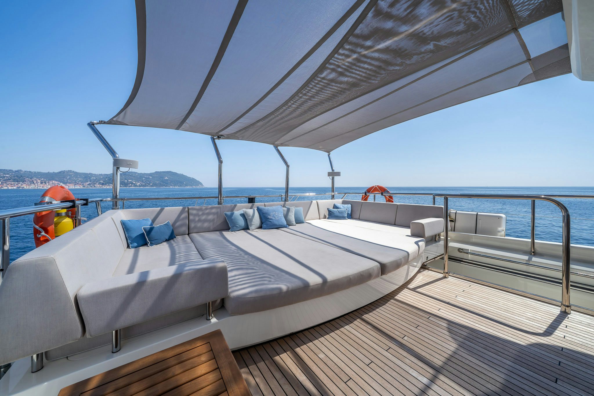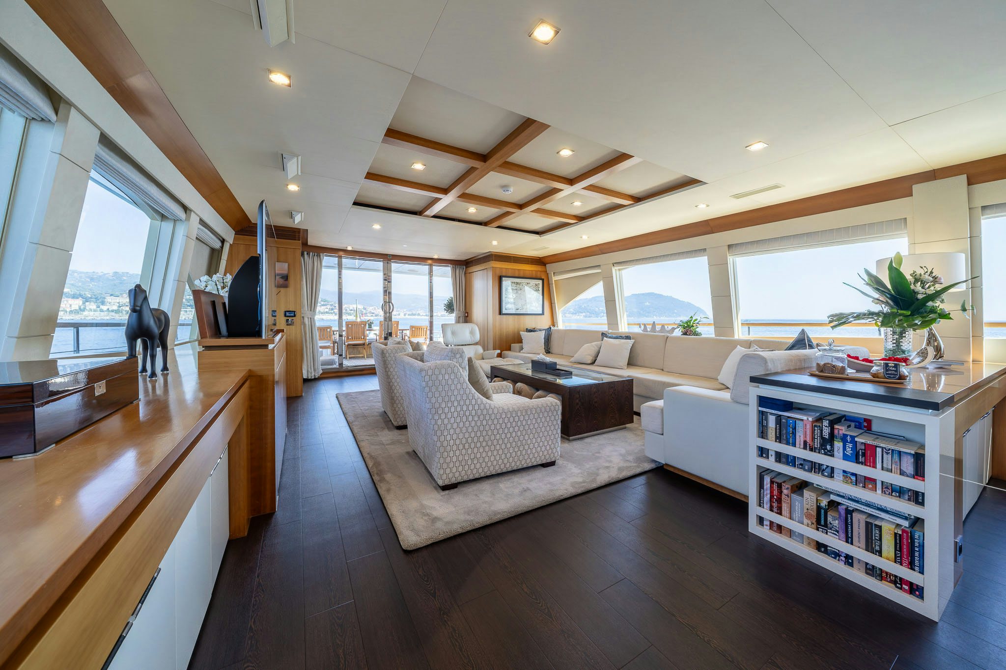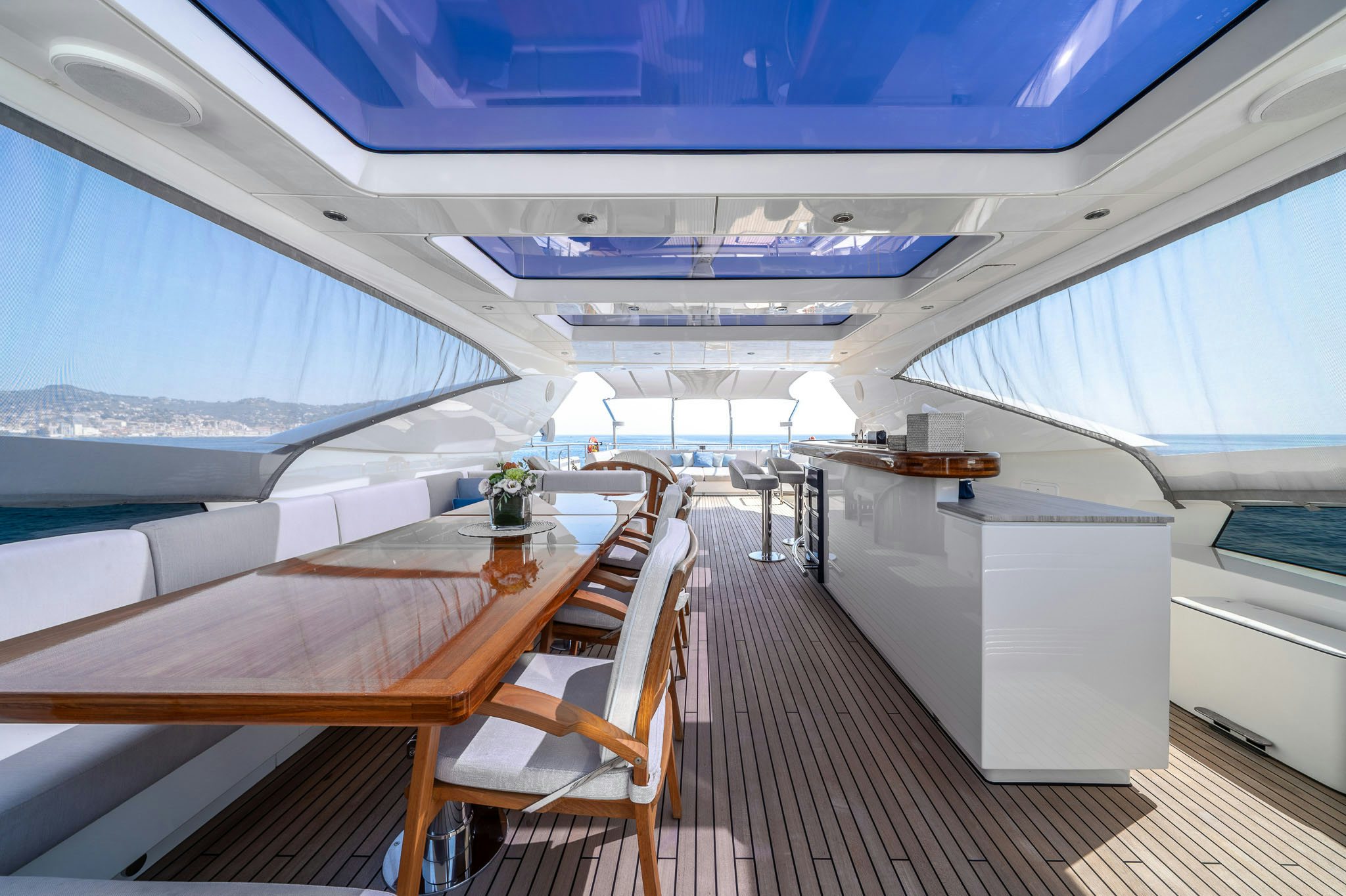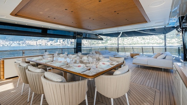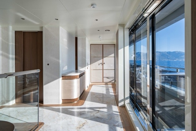 Her American walnut interior, 180-degree floor-to-ceiling windows, and alfresco spaces, including a flybridge with dining and bar, and a foredeck Jacuzzi, make MERCY OCEANS an excellent example of performance yachting.