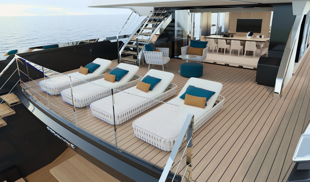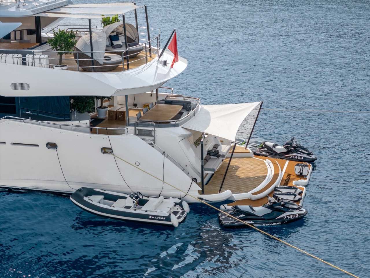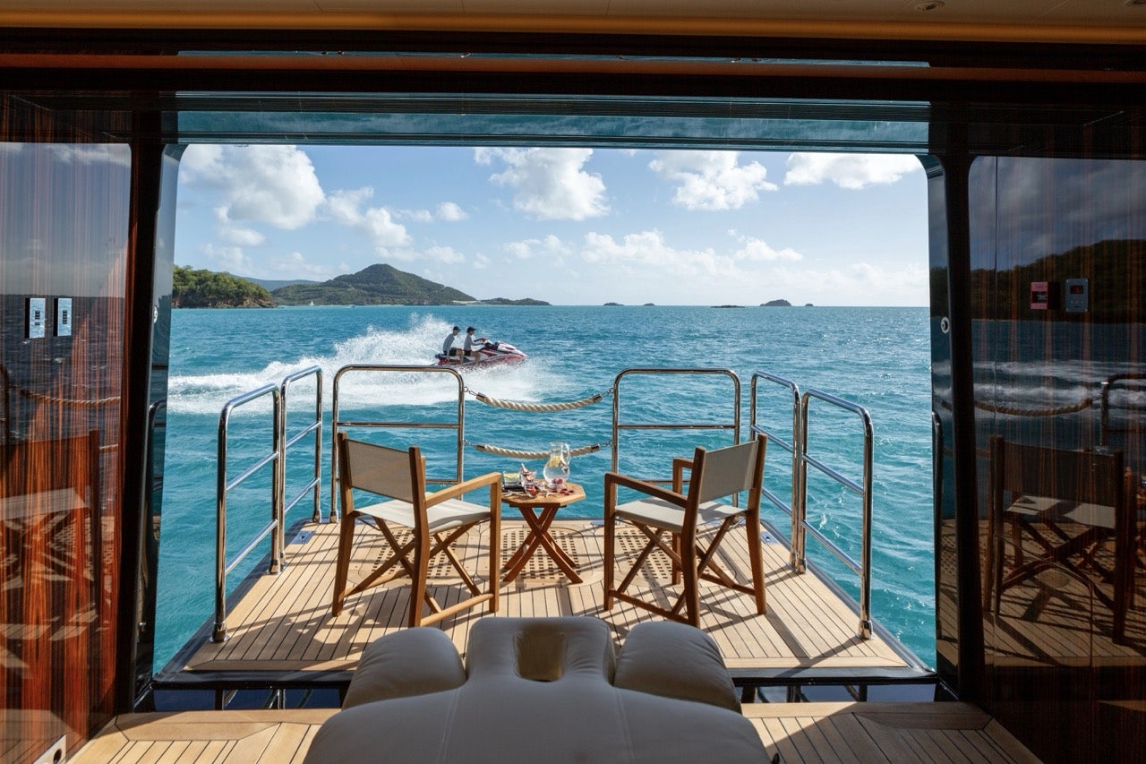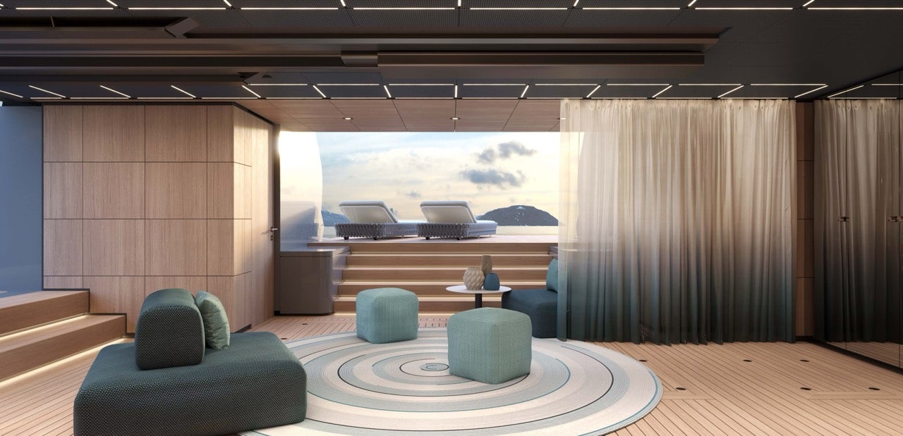 Aft, her hydraulic beach club doubles as a watersports hub, with storage for Seabobs, Jet Skis, and a custom inflatable dock pontoon.