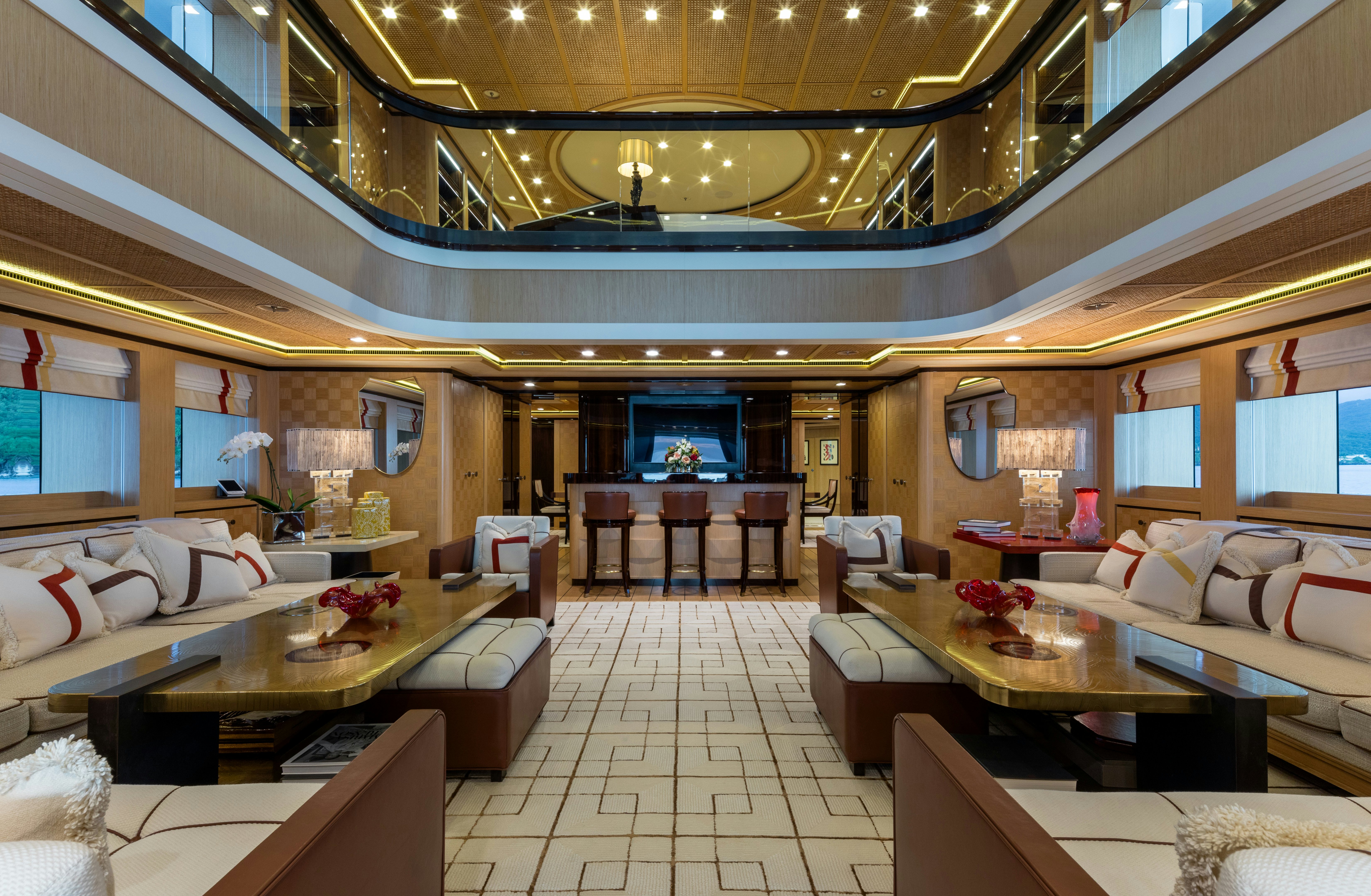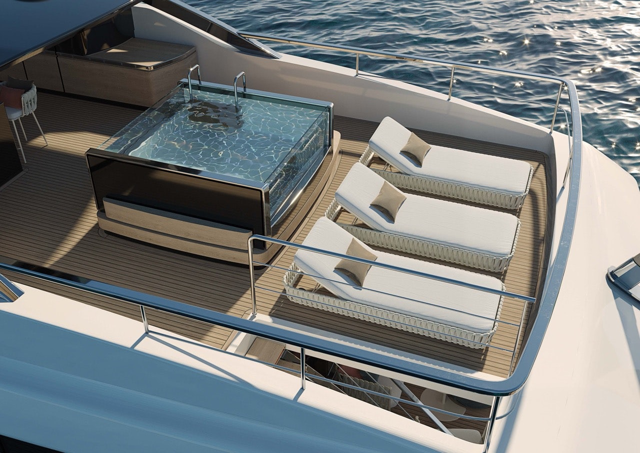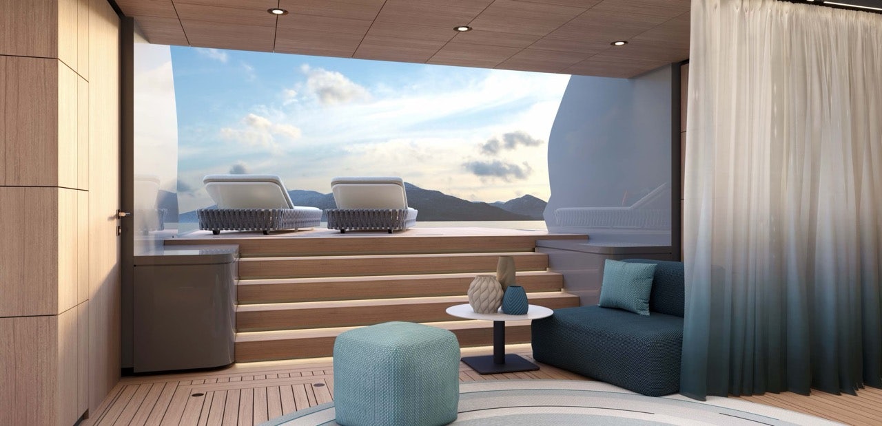 Aft, her hydraulic beach club doubles as a watersports hub, with storage for Seabobs, Jet Skis, and a custom inflatable dock pontoon.