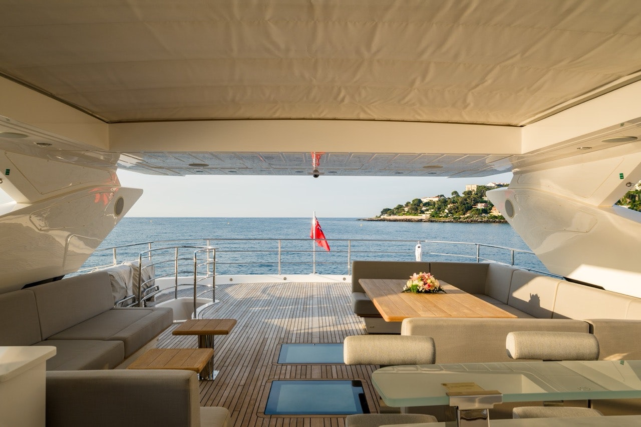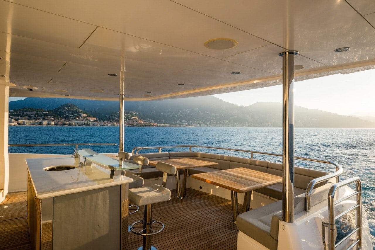 Her foredeck is one of the most impressive in her class. Yacht Broker Matt Palmer says, “The foredeck really is mightily impressive, with seating and sunbeds which cascade down to the Jacuzzi, a fantastic, elevated position where one can take in the ever-changing scenery. And by night, this area is transformed into an open-air cinema, which is a real hit for evenings together with the family.” The flybridge is equally versatile, now featuring a new bar, dining area, oversized daybeds, and retractable roof.