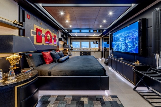Her bold black hull sets the tone for expansive outdoor spaces, including one of the largest aft decks in her class with a custom granite bar and lounge, a foredeck Jacuzzi with sunpads, and a sundeck featuring a DJ booth and cocktail bar. Inside, her Asian-inspired décor is defined by black leather, marble finishes, and bespoke furnishings. She accommodates 10 guests in four cabins, including a full-beam master and VIP, plus two doubles.