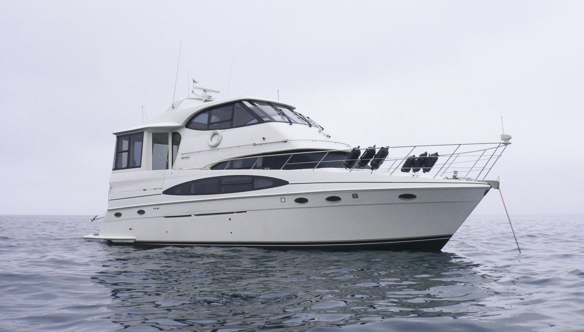 Motor Yacht HIGH CONCEPT accommodates five guests in three spacious staterooms. The yacht features a full-beam master and forward VIP each with an en-suite bath. Her mid-cabin was converted into a fully functional office featuring a built-in desk and separate washer and dryer.
