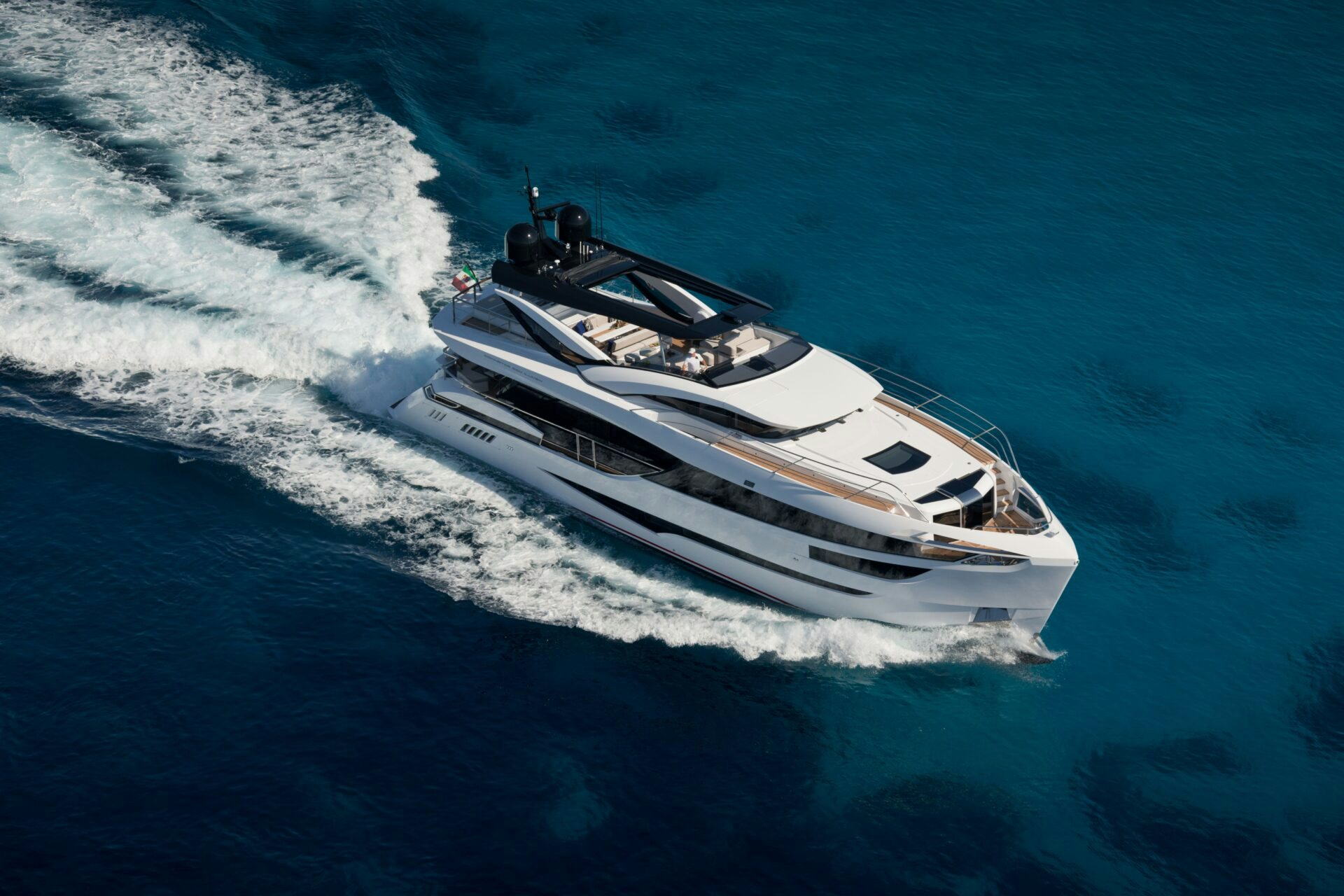 The luxury motor yacht’s custom interior, designed by the renowned Alberto Mancini, showcases contemporary styling complemented with rich marbles, woods and fabrics. Space and light are at the heart of her architecture, allowing views through floor-to-ceiling windows in rooms adorned with backlit white onyx, ebony and Zebrano wood, brushed steel and soft and hand-stitched Nubuck leather to create a sophisticated and opulent ambiance.