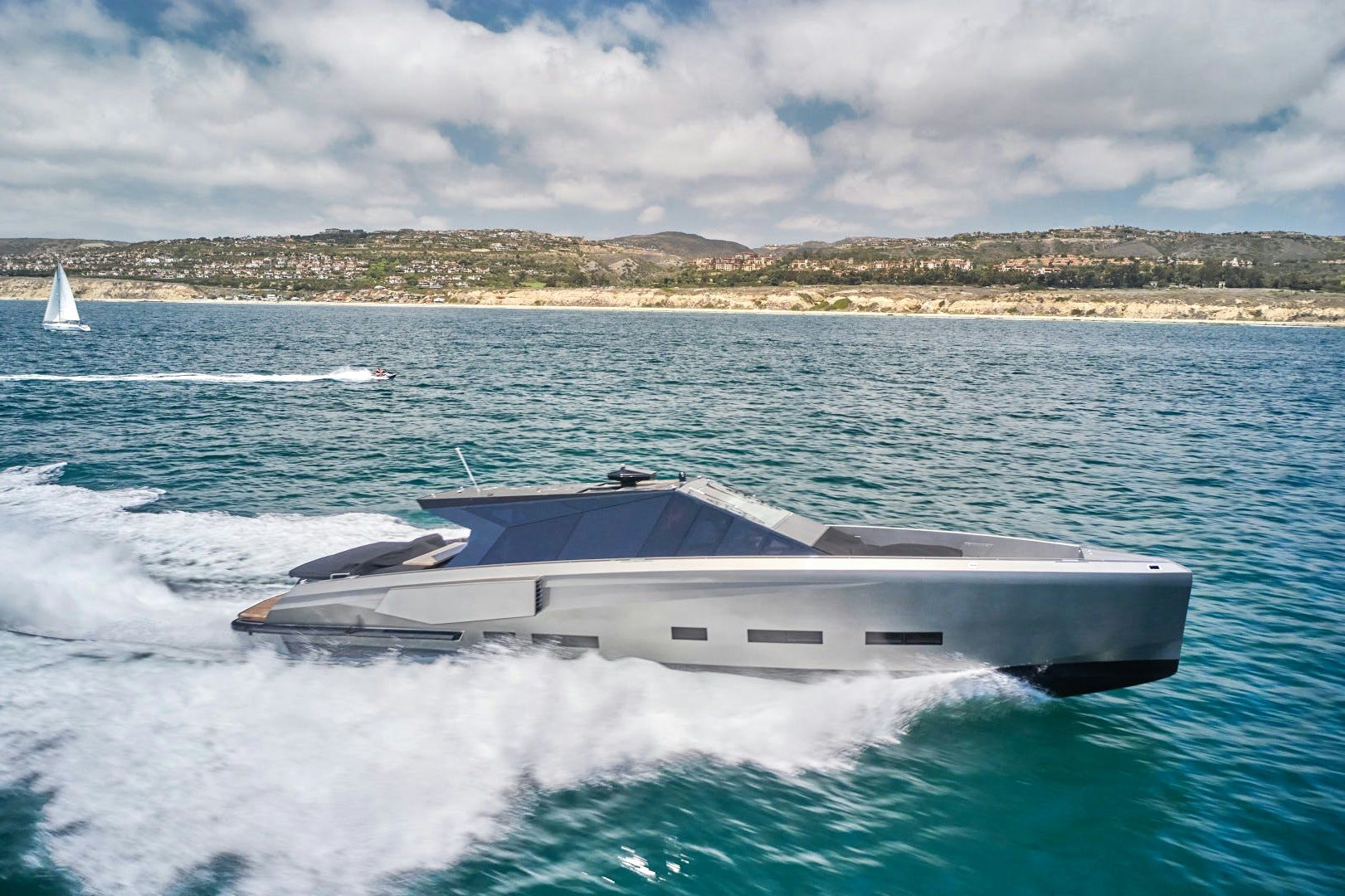 The exterior style of AIFOS is uncompromising and strong. Outdoor living is a breeze aboard thanks to a large settee on the aft deck with a teak table. A large sunpad is perfect for soaking in the rays and a large swim platform provides easy water access. An additional sunpad is found on the foredeck. This converts to a table for alfresco dining.