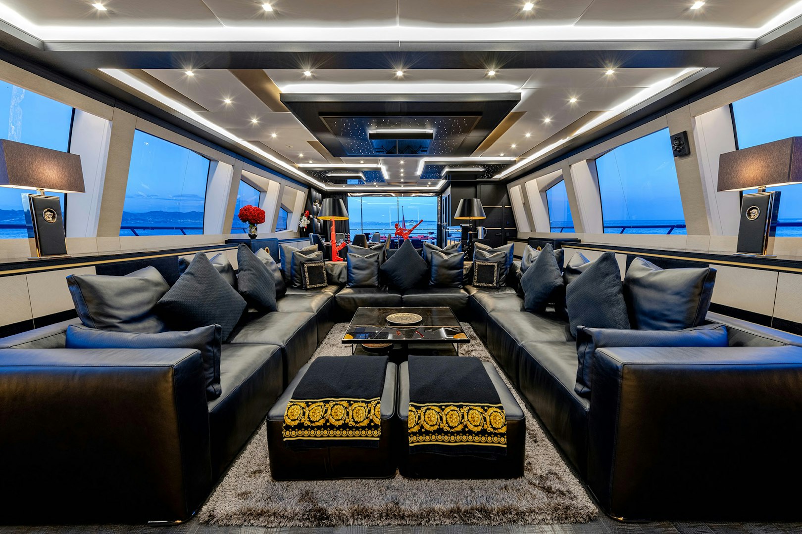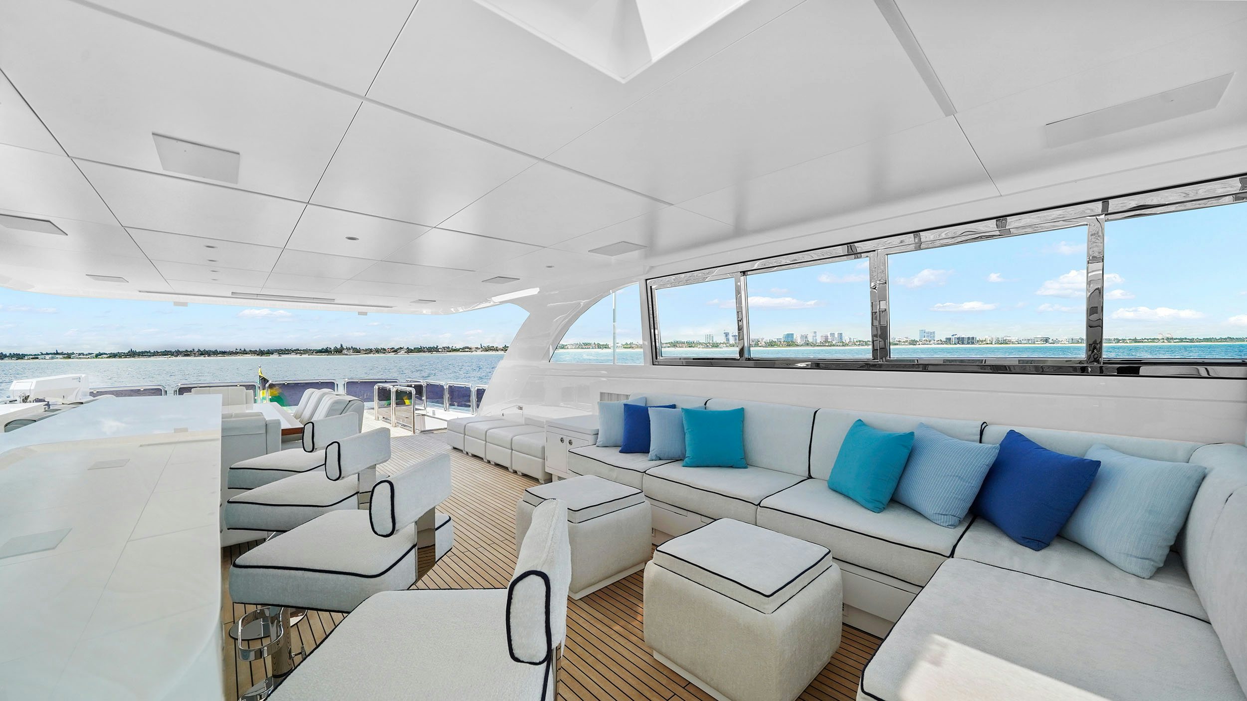 Up to 16 guests are welcomed across six staterooms, anchored by a full-beam master suite with a dedicated study and an adjacent convertible cabin, ideal for families or mixed groups. From her sundeck with Jacuzzi and full bar to shaded dining and lounging areas throughout, UNBRIDLED delivers an onboard experience centered on entertainment and comfort.