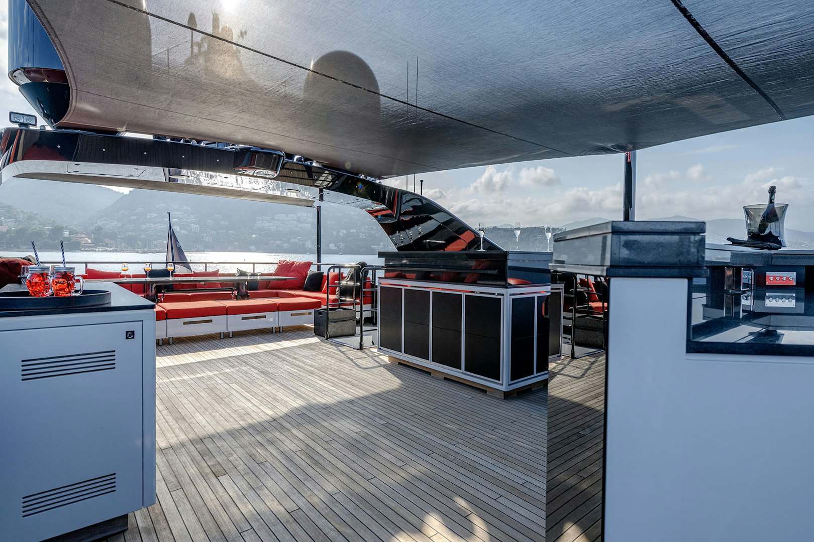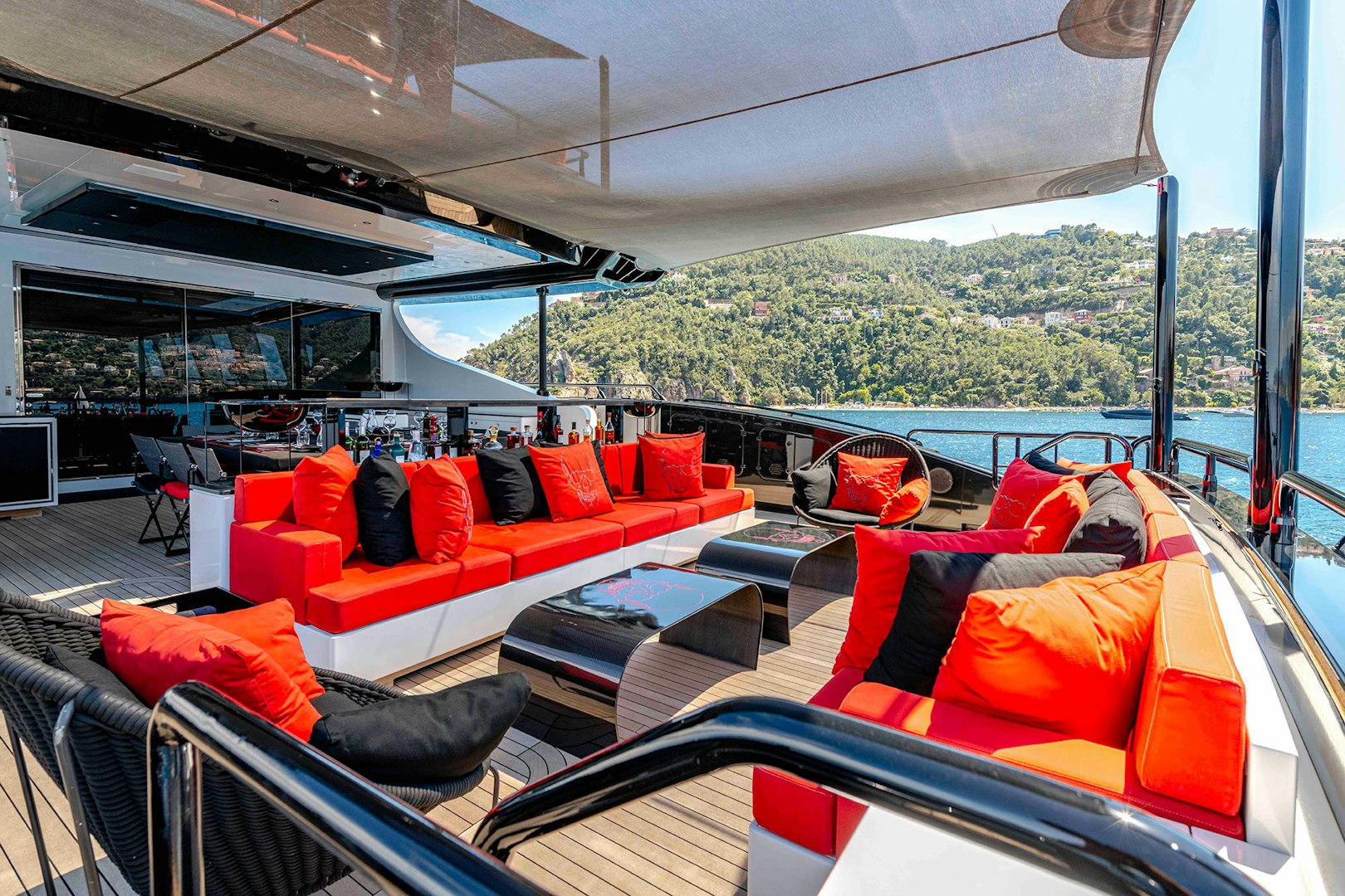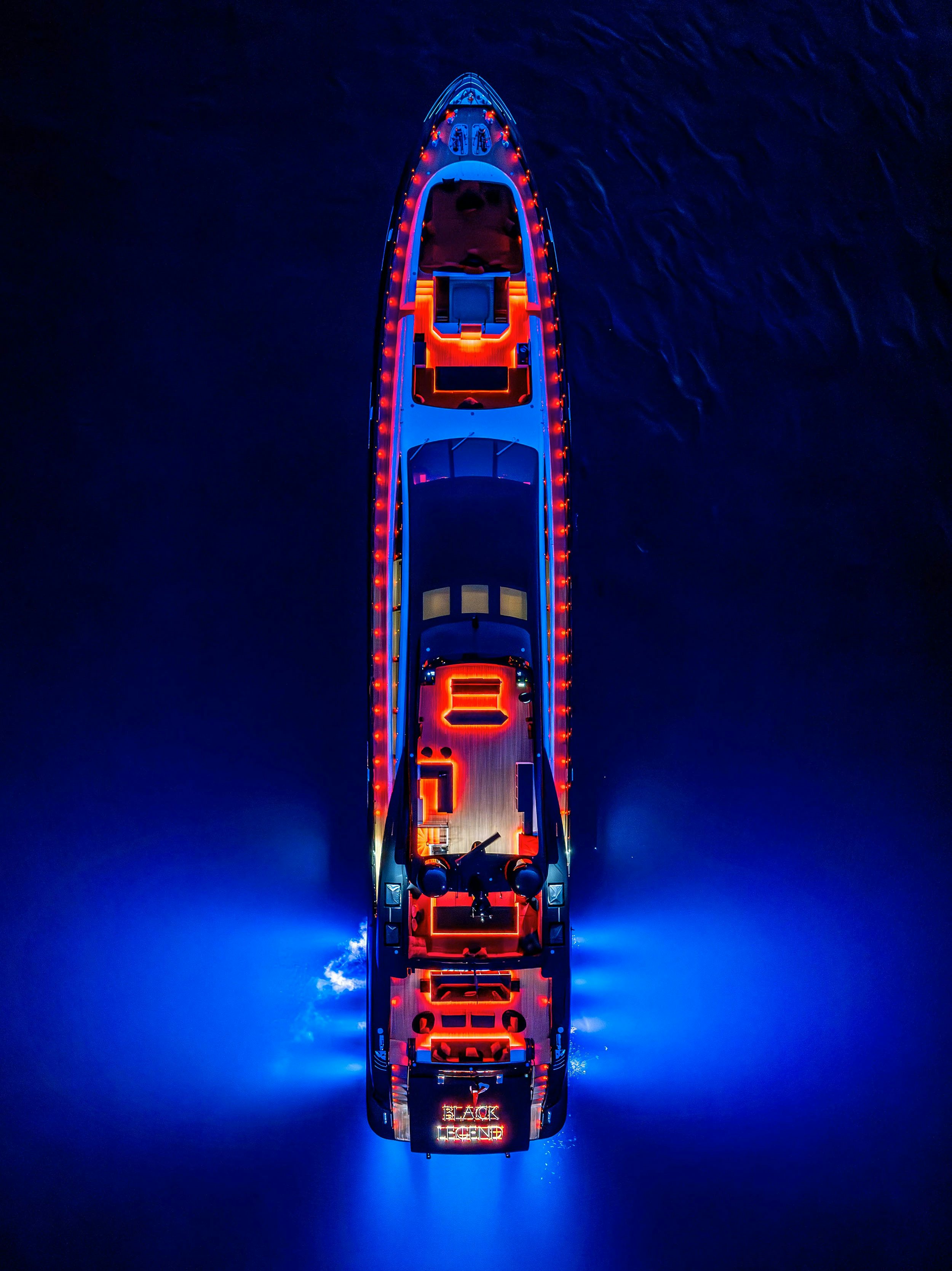 BLACK LEGEND and BLACK SAILS showcase two distinct expressions of high-performance yachting, united by Italian craftsmanship and unmistakable presence. As broker Ed Dickinson notes, “both yachts are high-performance vessels, finished to an exceptional standard by leading Italian shipyards, designed to ensure the utmost luxury and comfort while also offering unrivalled speed for their size.” BLACK LEGEND, the most iconic Mangusta 165E delivered, embodies that philosophy through a 35-knot top speed, aggressive styling, and deck spaces designed for large-scale entertaining, including one of the largest aft decks found on any 50-meter yacht, multiple bars, and a dedicated DJ booth.