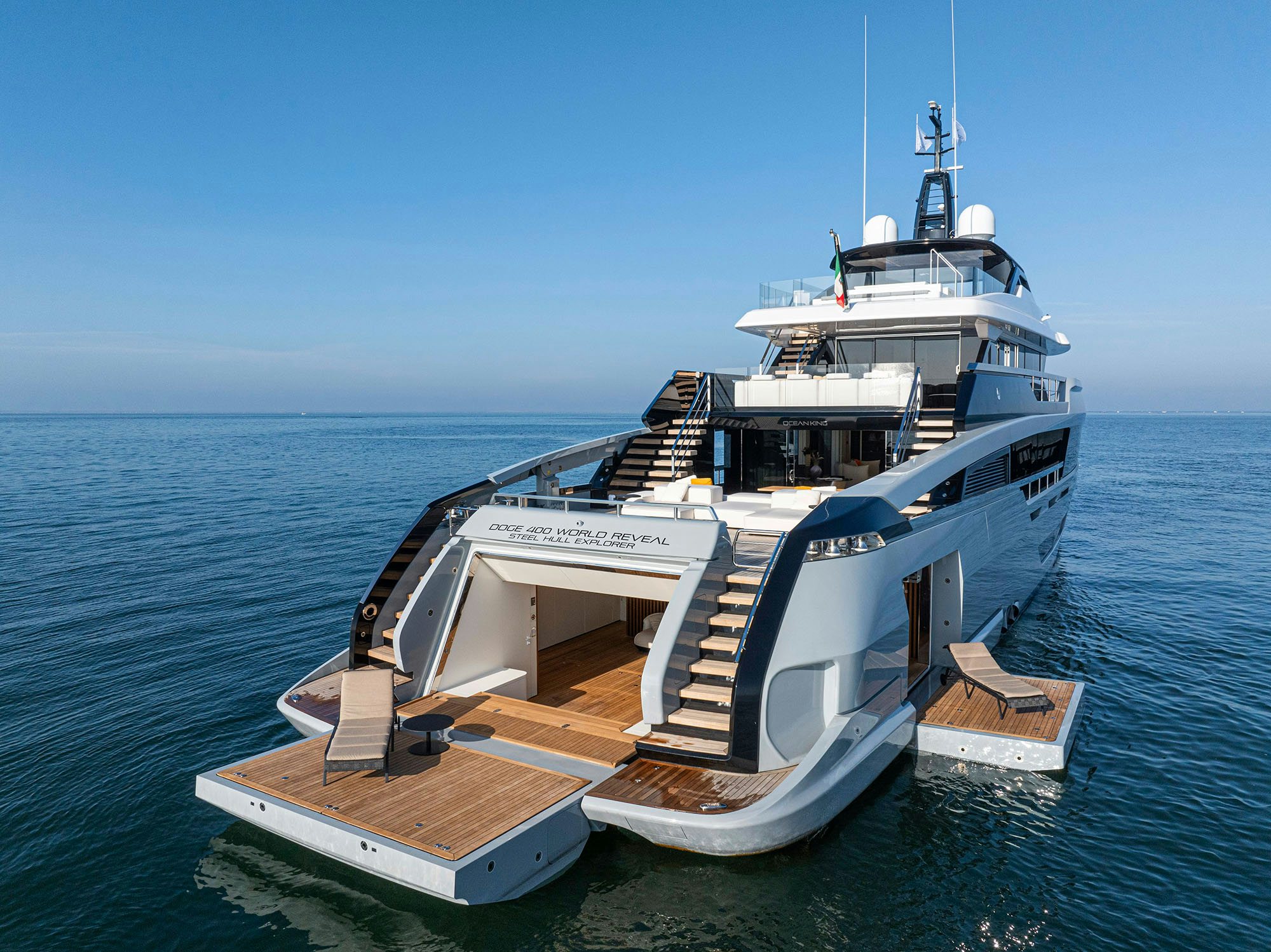 Ocean King DOGE 400 is an explorer conceived for owners who value volume, versatility, and long-range confidence. As broker Gabriele Modica Ragusa explains, “the DOGE 400 is an explorer built in steel and aluminum, with great volume, a huge beach club, a large pool aft, and a custom glass Jacuzzi on the sundeck.” Measuring 132’ (40.38m), she is the debut model of the Doge series and reflects Ocean King’s commercial-grade construction philosophy paired with contemporary Italian design.