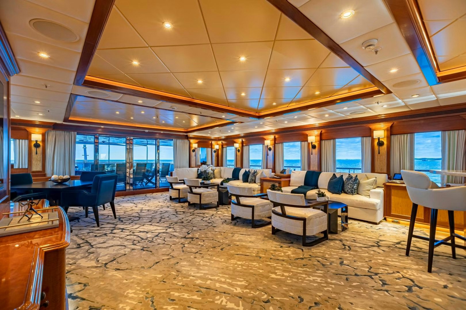 UNBRIDLED remains one of the most compelling entertainment-focused yachts on the market, blending Trinity pedigree with a layout designed to bring people together. Refurbished in 2015 and refit again in 2019, she is presented in pristine condition, where modern amenities live in harmony with traditional styling. She is a yacht built for hosting, with expansive social spaces flowing from the main salon and formal dining area to a skylounge that functions as the heart of the yacht, complete with a full bar and games table.