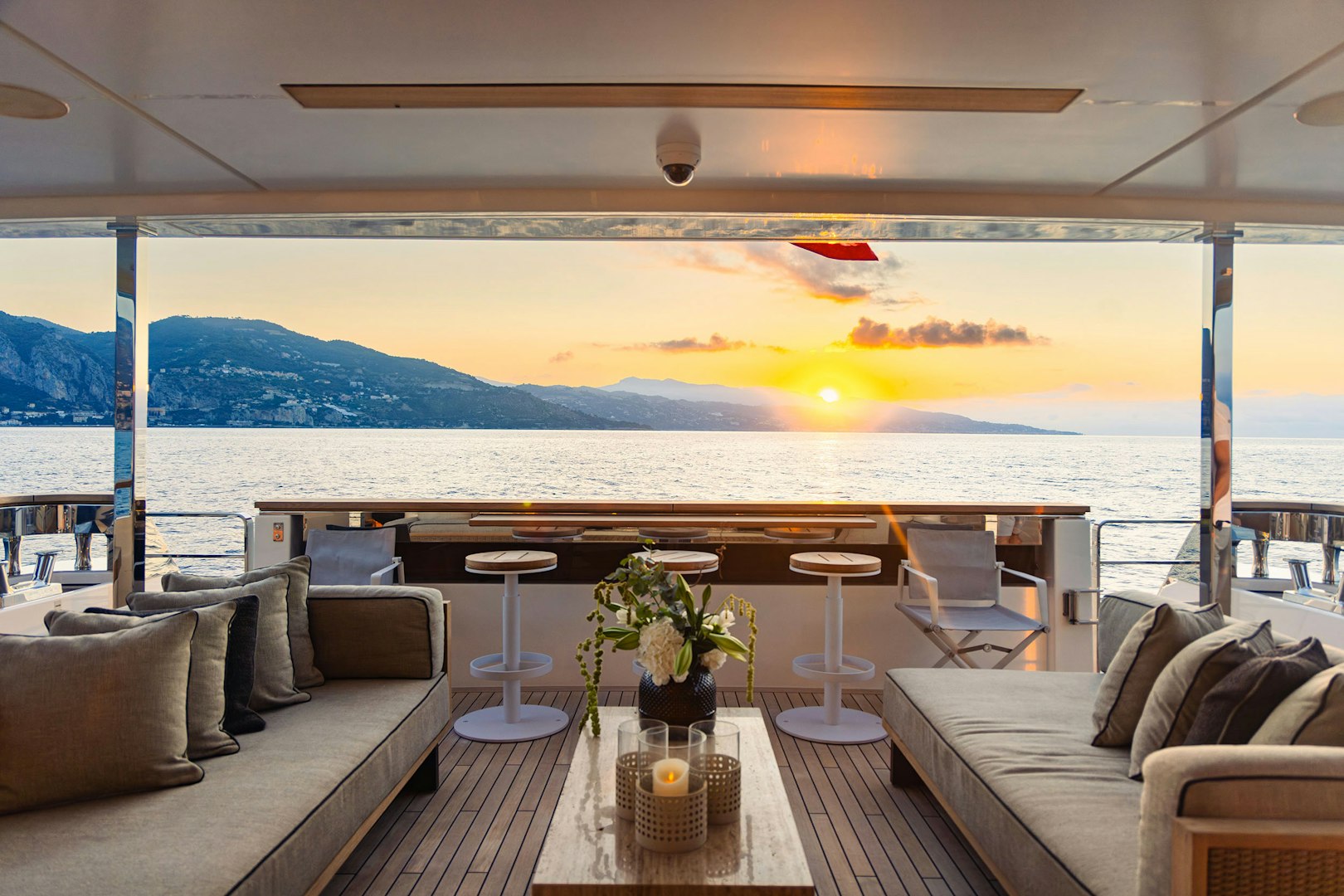 It is outdoors, however, where guests tend to gravitate. Zelda identifies the top deck as the space where guests “spend most of their time,” and it is easy to see why. The standout feature of her two-year refit by Monaco Marine is the impressive aft bridge deck, now home to a Jacuzzi positioned forward and surrounded by sun beds and seating, along with two large lounge areas with sofas and teak occasional chairs. The top deck houses gym equipment and a smaller seating area with leather sofas, offering uninterrupted views while cruising between islands.