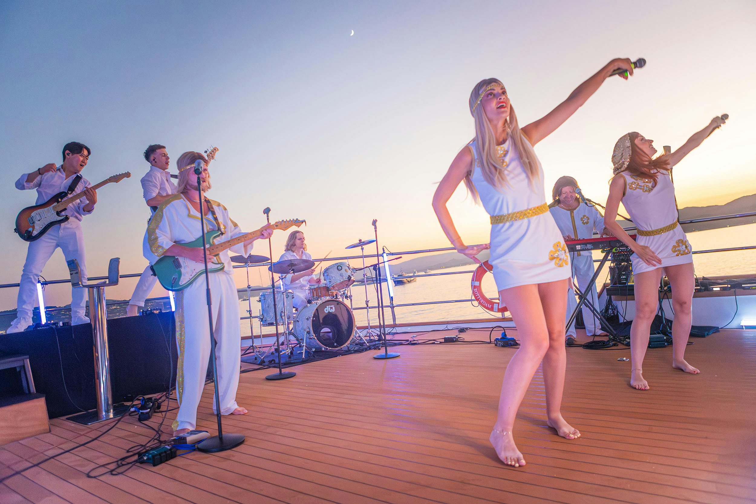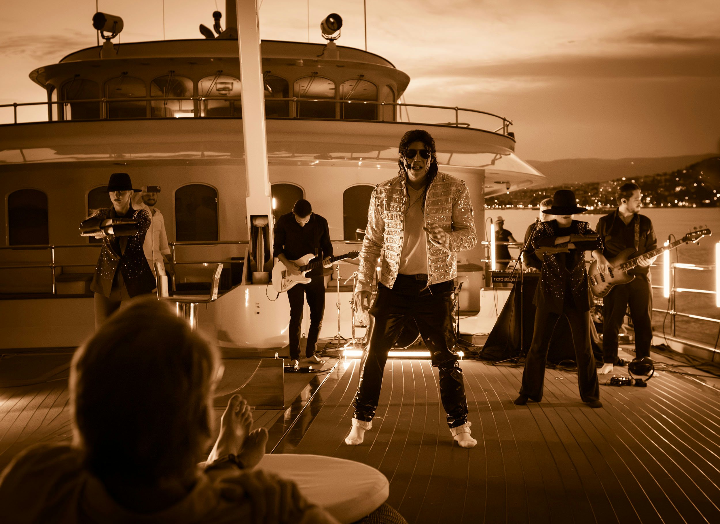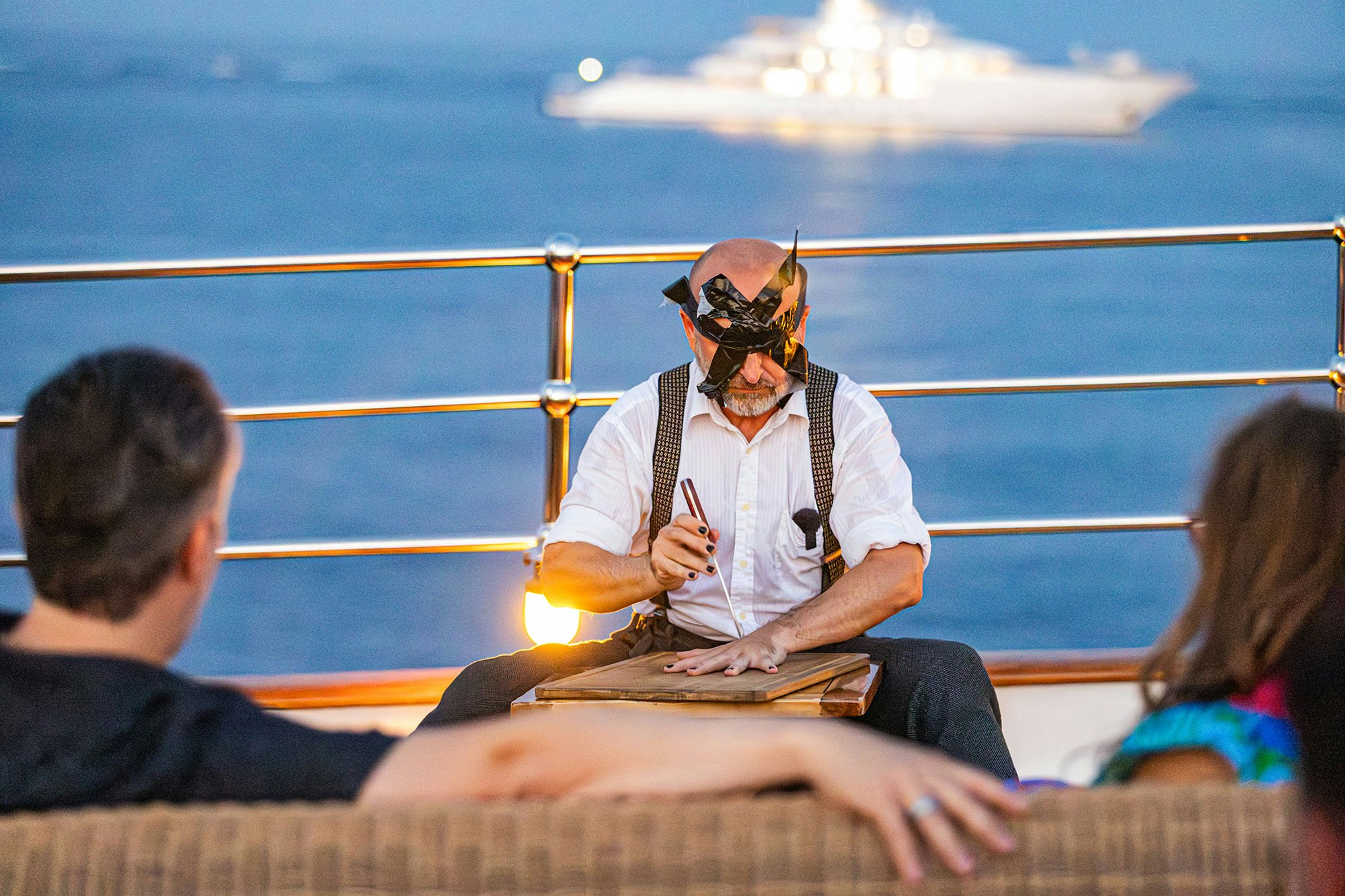 Eleven shows in seven days, spanning live music, murder mystery featuring a real Bond girl, cabaret performances, and a Michael Jackson tribute that had guests dancing beneath the stars. Working closely with the captain and crew, each show was tailored to the guests’ personalities, with Aquavistas weaving every performance into the yacht’s daily activities. Every detail furthered the Principal’s second request: that no one should ever stop being surprised (and that the entire itinerary had to remain a secret until each show was about to happen). The cloak-and-dagger logistics were in full swing for the entire week.