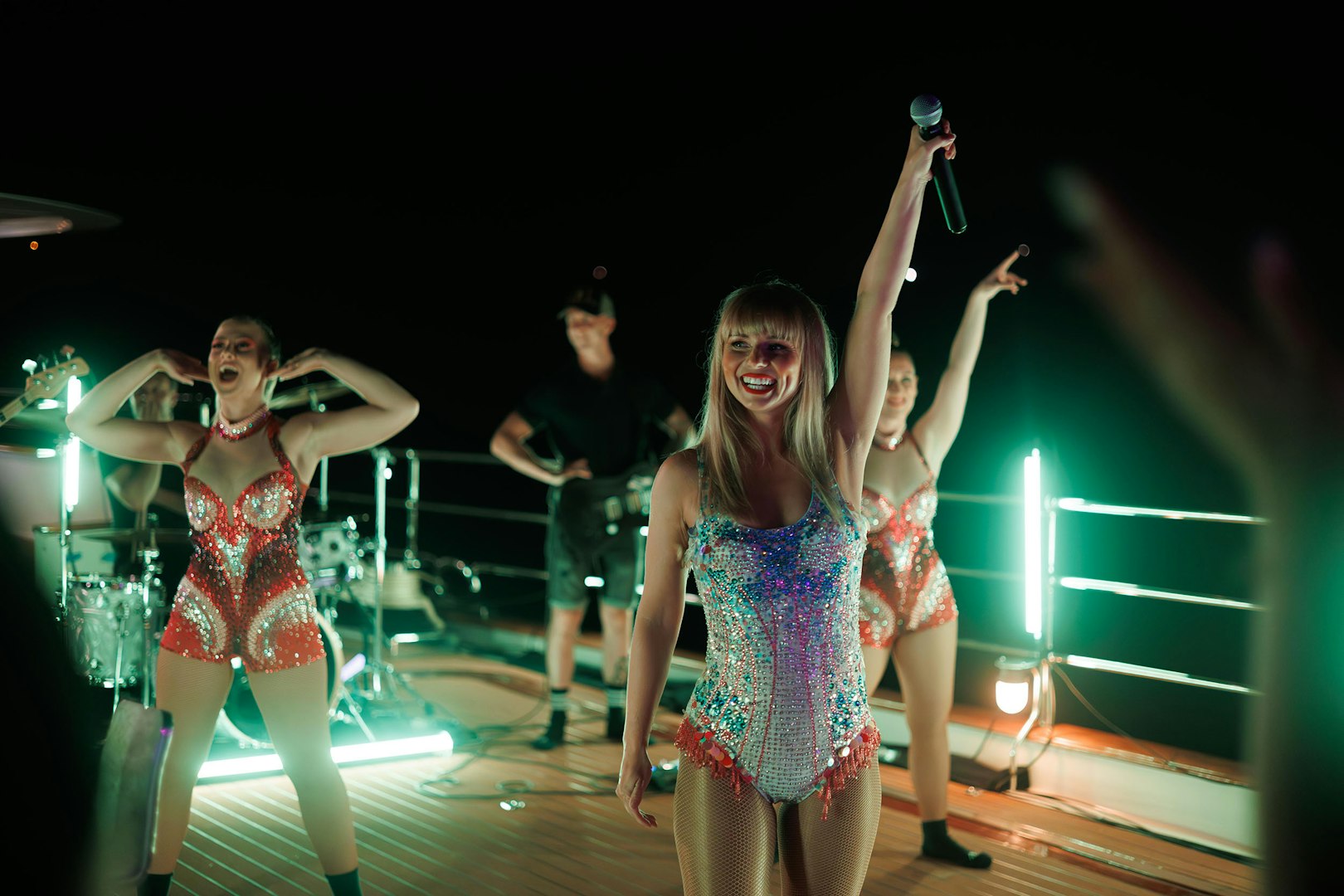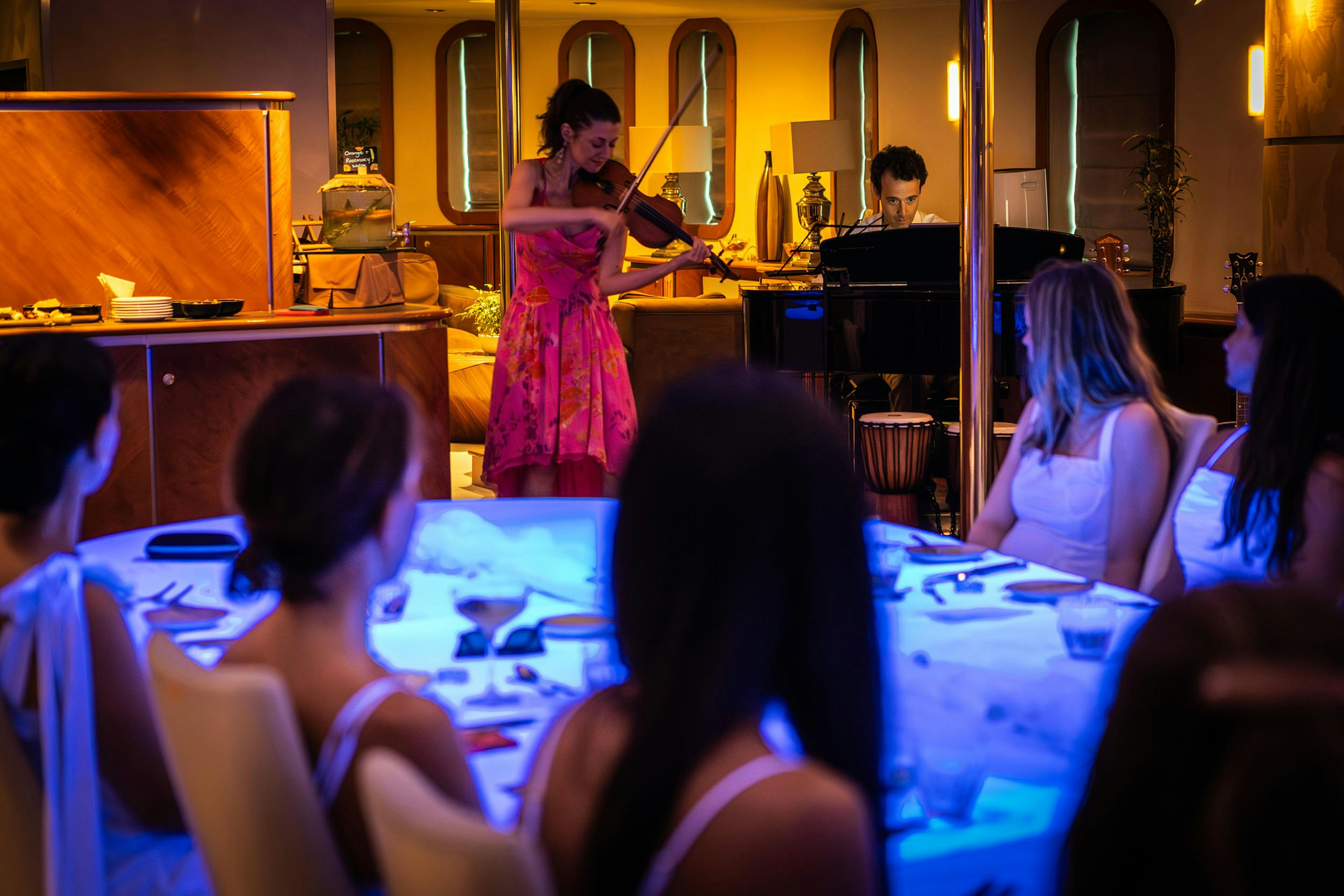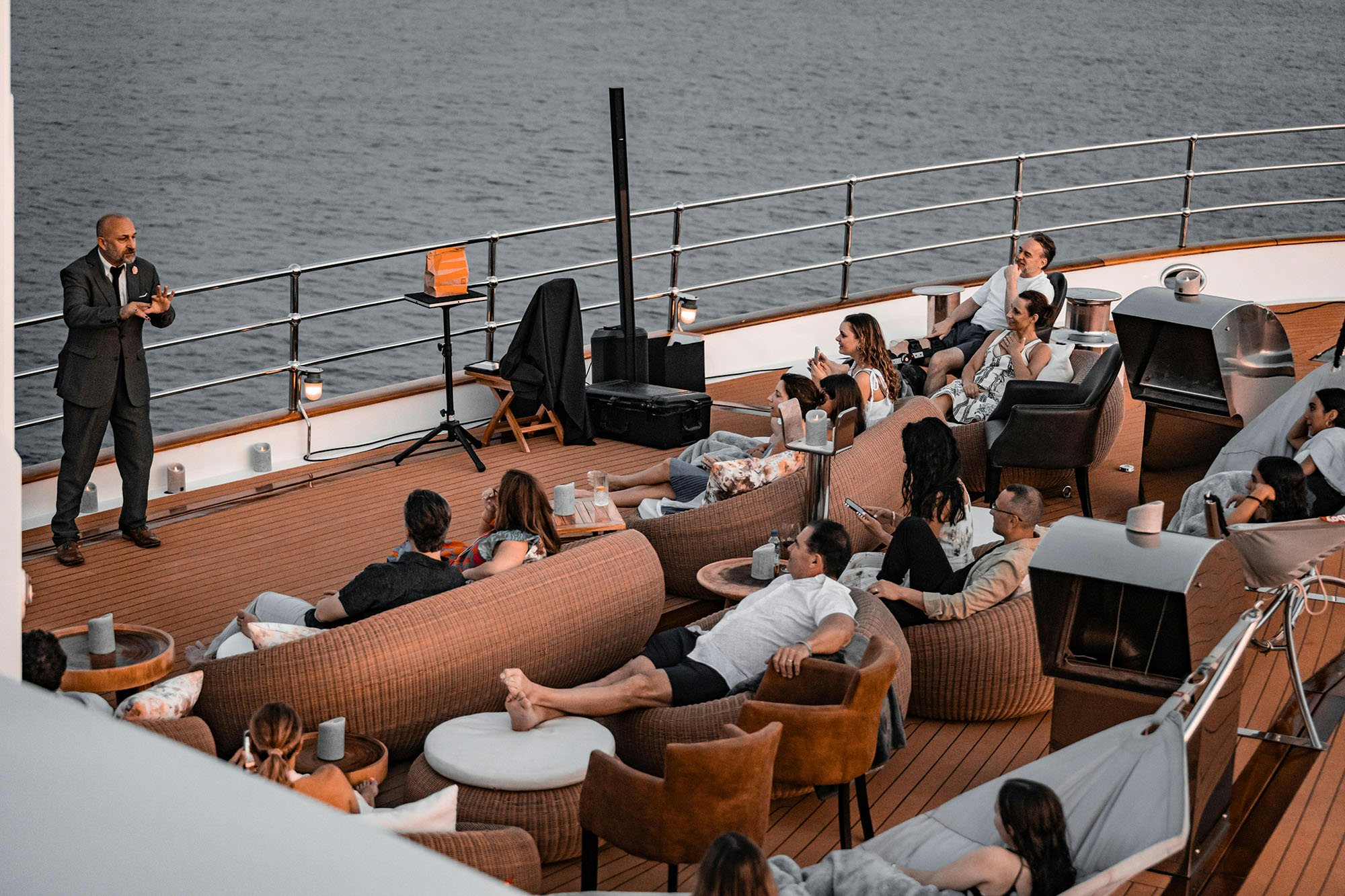 Eleven shows in seven days, spanning live music, murder mystery featuring a real Bond girl, cabaret performances, and a Michael Jackson tribute that had guests dancing beneath the stars. Working closely with the captain and crew, each show was tailored to the guests’ personalities, with Aquavistas weaving every performance into the yacht’s daily activities. Every detail furthered the Principal’s second request: that no one should ever stop being surprised (and that the entire itinerary had to remain a secret until each show was about to happen). The cloak-and-dagger logistics were in full swing for the entire week.
