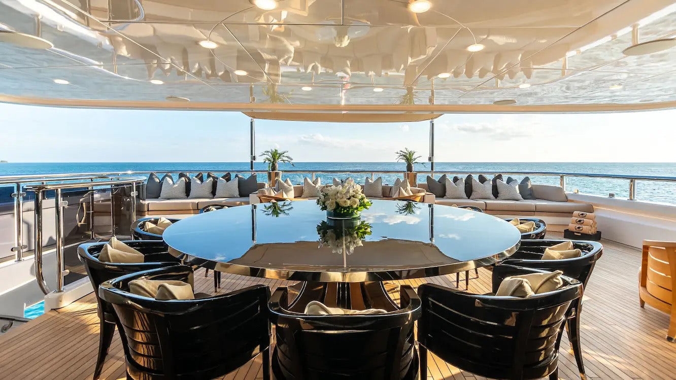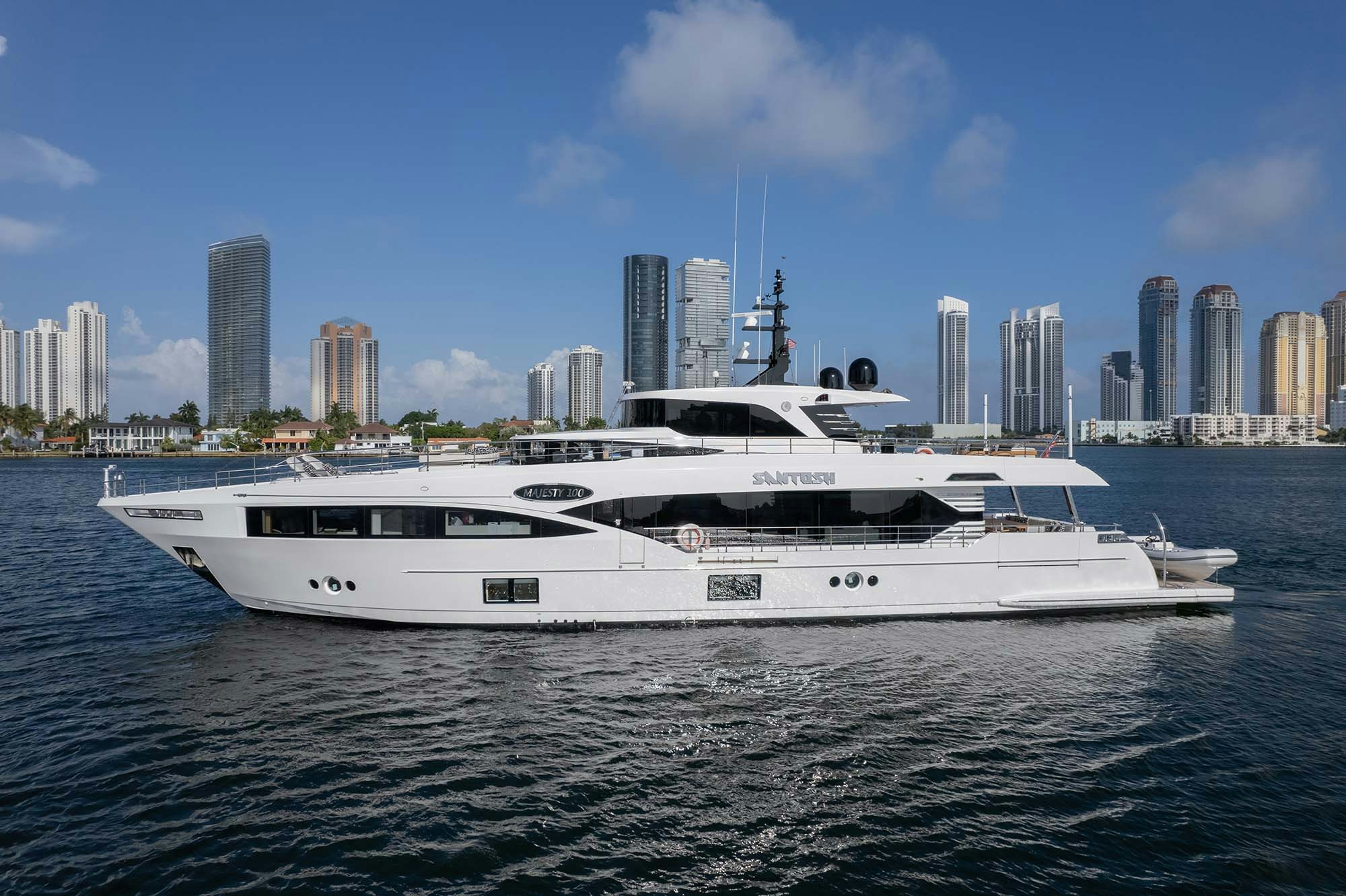 The 2020 Gulf Craft SANTOSH, measuring 108’ (32.92m) in length, offers a wonderful charter atmosphere with amazing alfresco areas and a charter-savvy crew. She benefited from a 2022 refit leaving her in primed condition. Entering her main salon, her floor-to-ceiling windows are complemented by intricate ambient lighting. Tasteful hints of color, from both furniture and artwork, are accompanied by an otherwise neutral color palette. SANTOSH seamlessly blends indoor and outdoor spaces; guests can enjoy movies in the main salon or a cup of coffee on the main deck aft. Her foredeck invites guests to lounge on the large U-shaped seating area or lay out on the oversized sunpad. A notable feature that sets SANTOSH apart is the giant inflatable projector screen, perfect for the ultimate alfresco movie night.