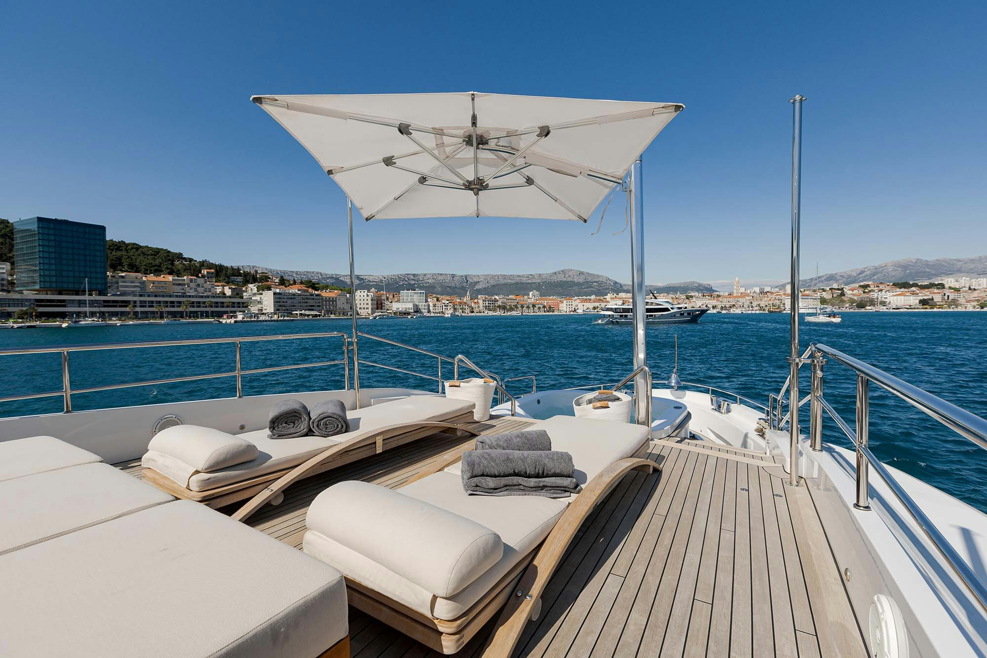With a super sleek design and the latest amenities in luxury cruising, the 131’ (40.06m) 2020 Sunseeker TC is a fantastic tri-deck charter yacht, exuding modern glamor. Her interior, penned by Candy & Candy, is opulent and contemporary. The many expansive windows offer panoramic views and her furnishings are comfortable and elegant. TC’s skylounge offers a cinema-like experience with a 103” TV, a U-shaped couch and a full bar. Guests can look forward to endless alfresco entertainment, including her spectacular beach club featuring a well-stocked toy chest, a floating platform and a custom-made Aquabana party Bana with a tent top with seating for up to 10 guests. TC’s standout charter program is renowned for its stellar crew and seven-star chef-guests can expect nothing less than an extraordinary experience when chartering onboard TC.