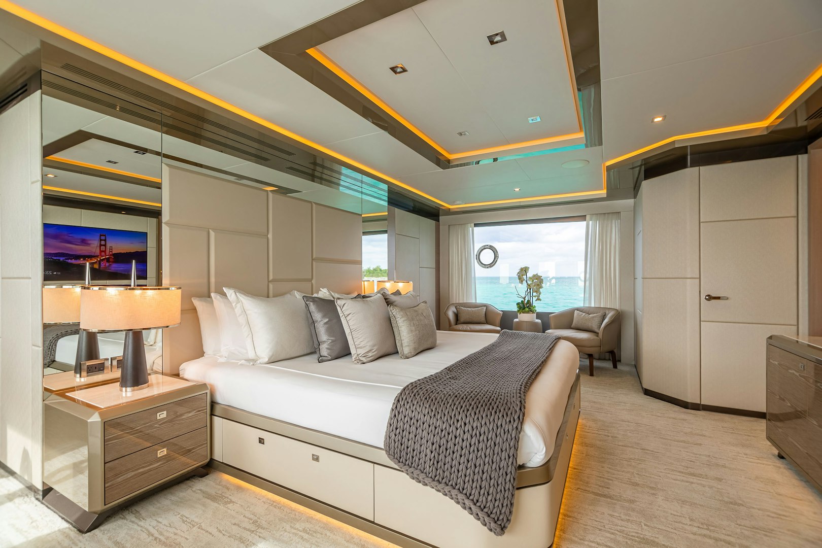 Guest accommodations are equally practical and well-considered. BOA VIDA accommodates up to 10 guests across five staterooms, including a full-beam owner’s suite on the main deck with a king bed, private sitting area, hidden television and a spacious ensuite featuring dual toilets and sinks, a separate shower and a large soaking tub. On the lower deck, two VIP cabins with queen beds and two convertible twin staterooms each include private en-suites and dedicated vanity or desk areas. Crew quarters accommodate six.
