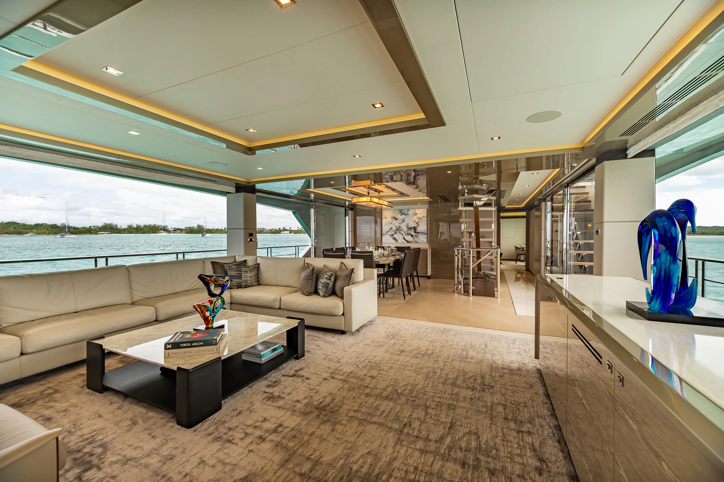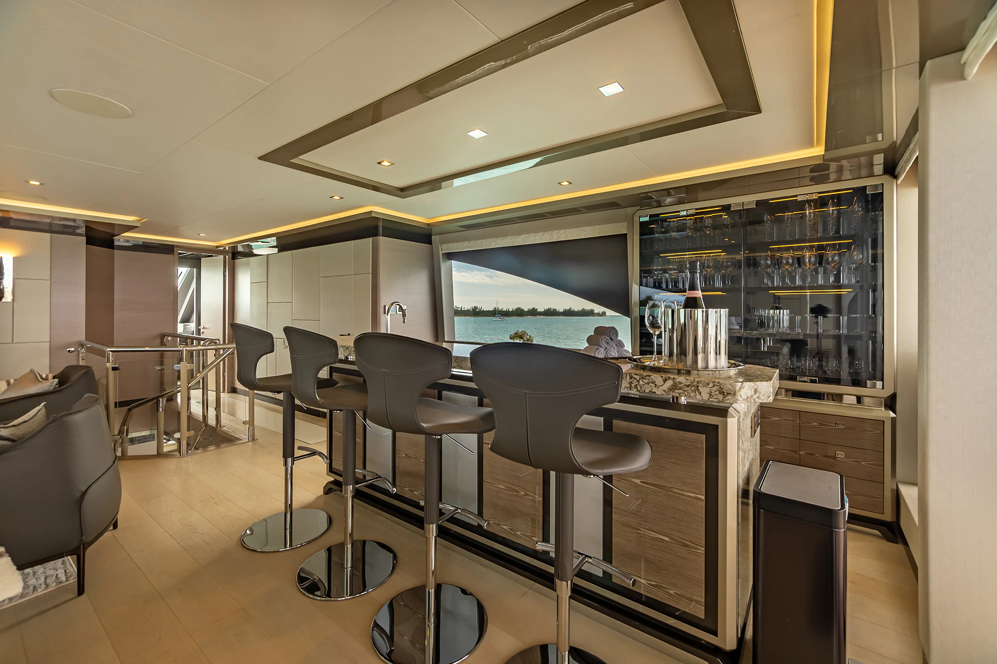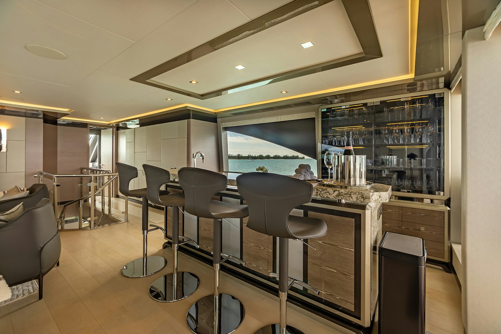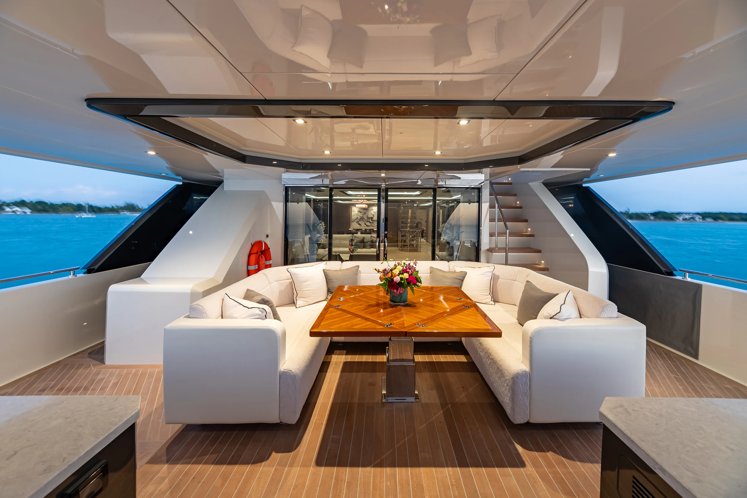 On the main deck aft, a raised U-shaped seating area faces the swim platform and is paired with a nearby wet bar and service station, flowing directly into the main salon through sliding glass doors. The connection between interior and exterior spaces is intentional. Inside, the salon features an L-shaped lounge, a concealed fold-down television and floor-to-ceiling windows, finished in light woods including white oak and high-gloss accents.