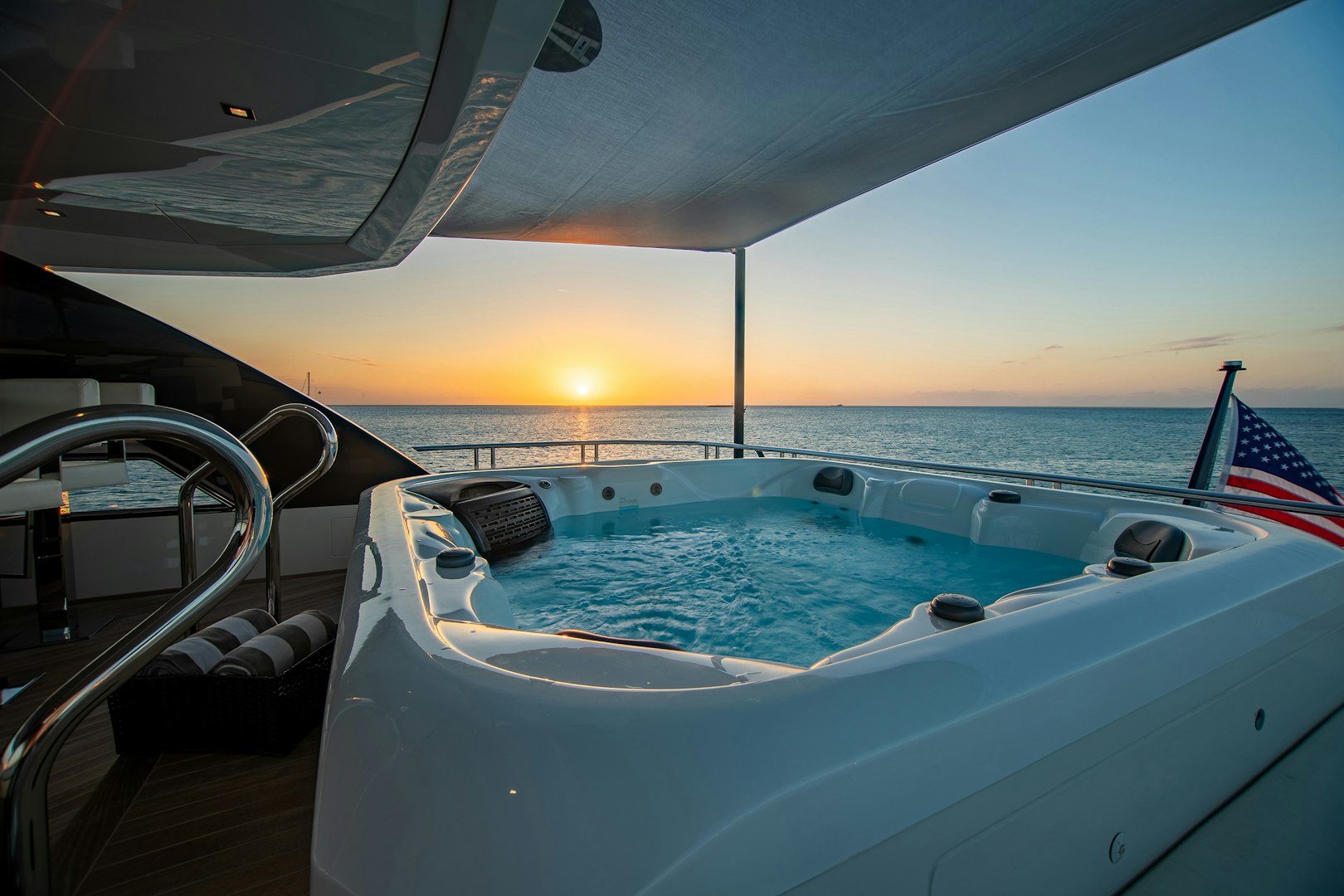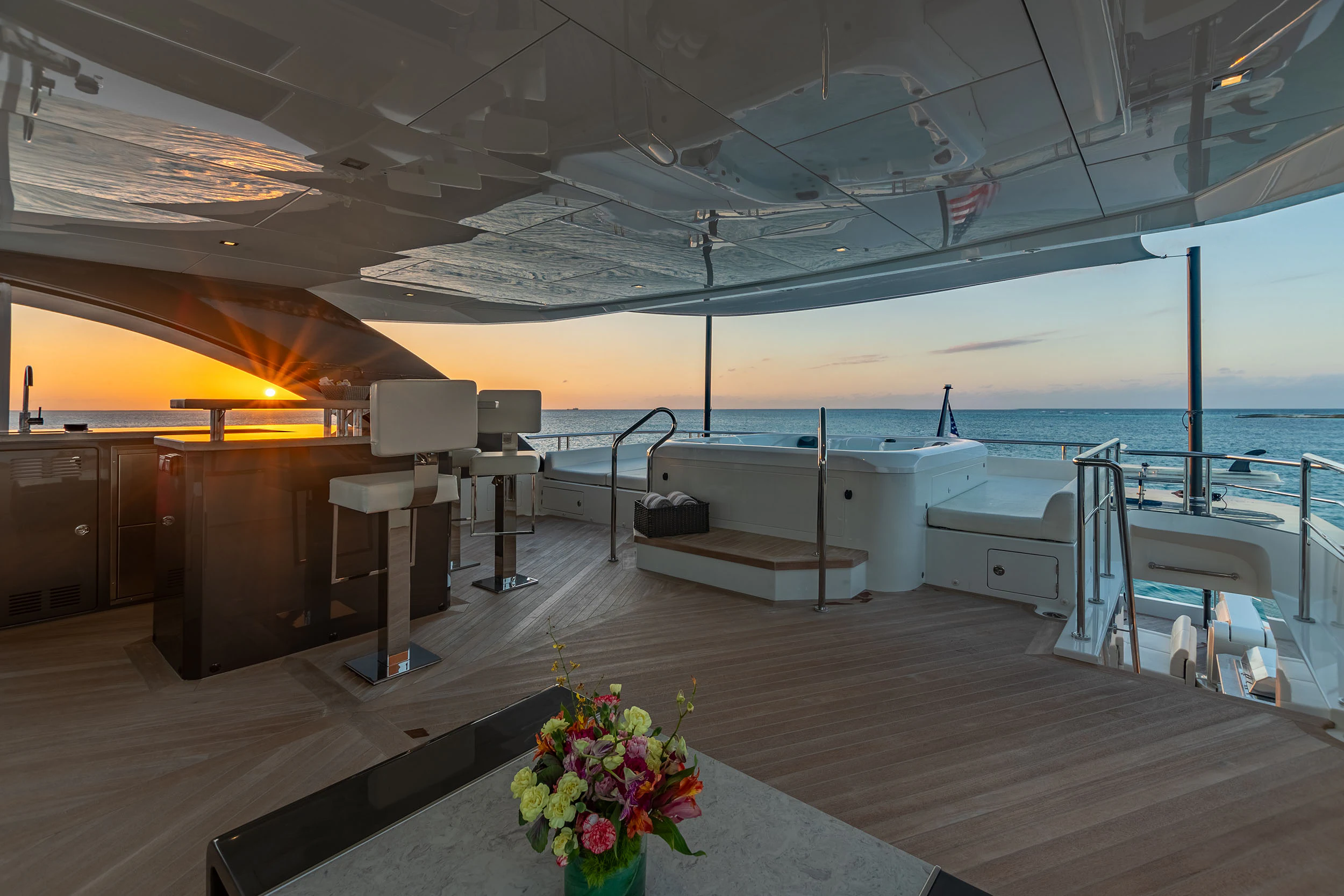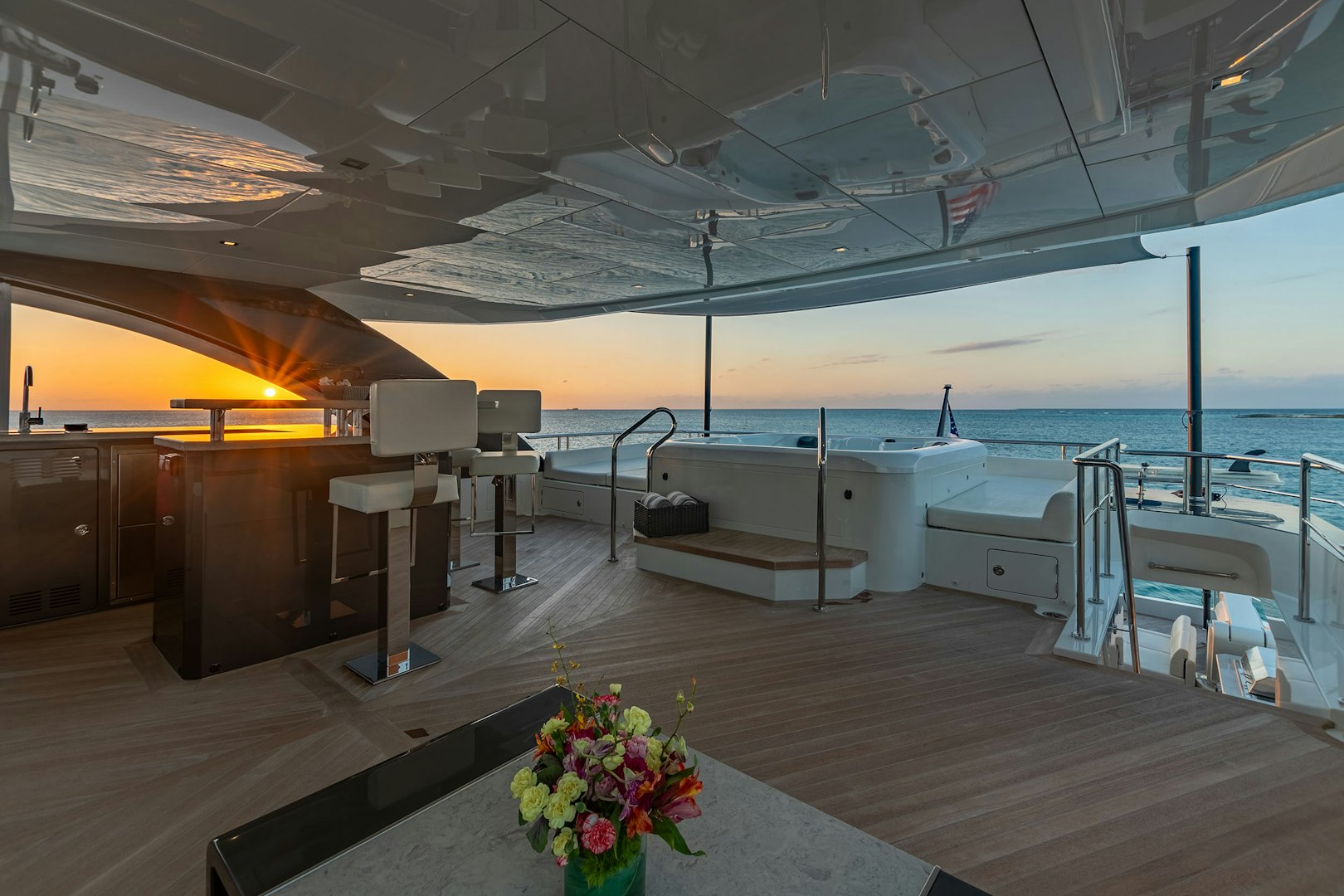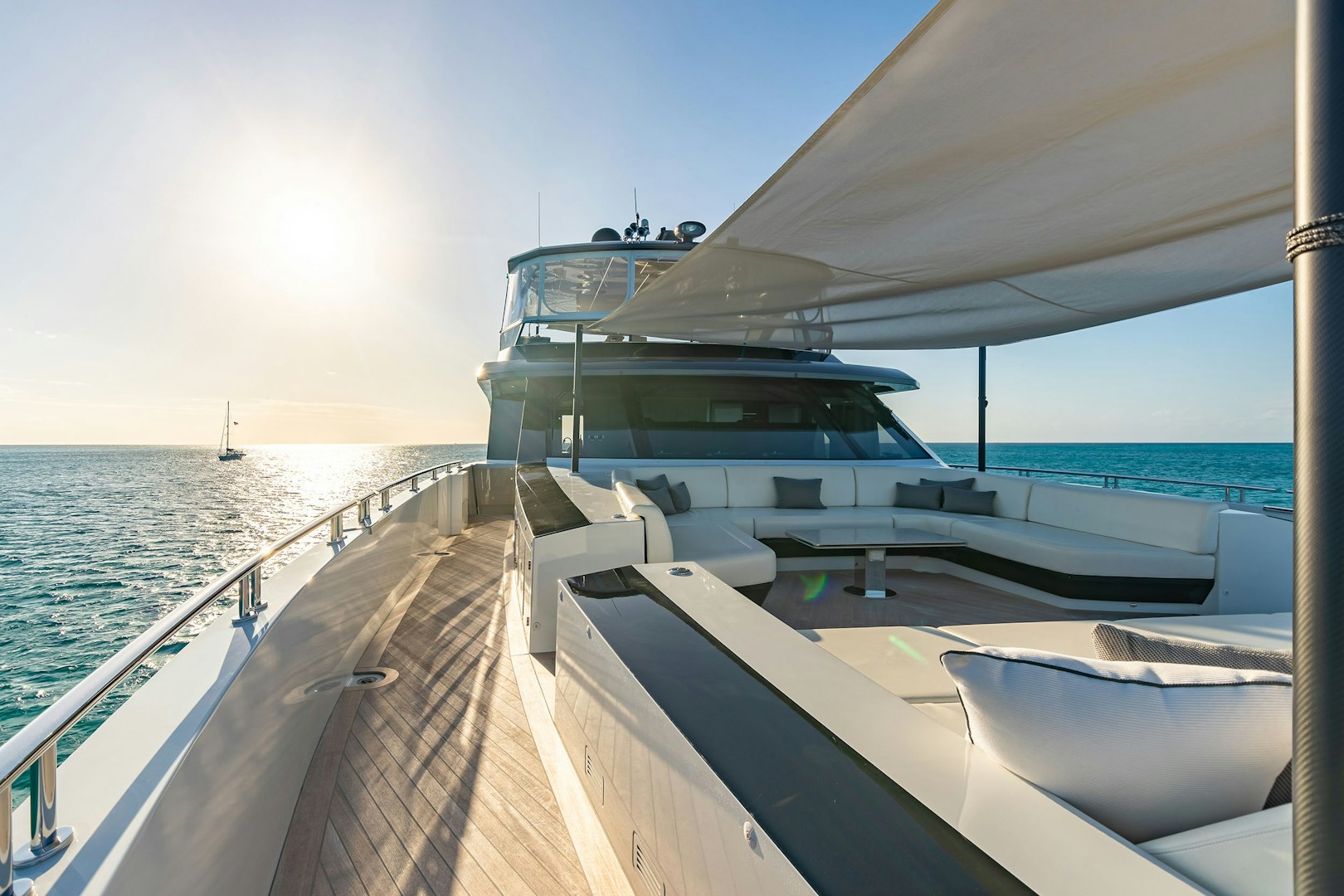 As guests move upward, additional entertainment spaces unfold. The skylounge aft is arranged with a large hexagonal dining table for 10, complemented by a full bar and barbecue for open-air dining with optional shade. Above, the sundeck features a Jacuzzi, multiple sunpads, a reversible lounge arrangement and another wet bar, offering flexibility between social gatherings and relaxed afternoons. Forward, the bow includes a broad sunpad with adjustable headrests and a U-shaped seating area positioned for open views and breeze.