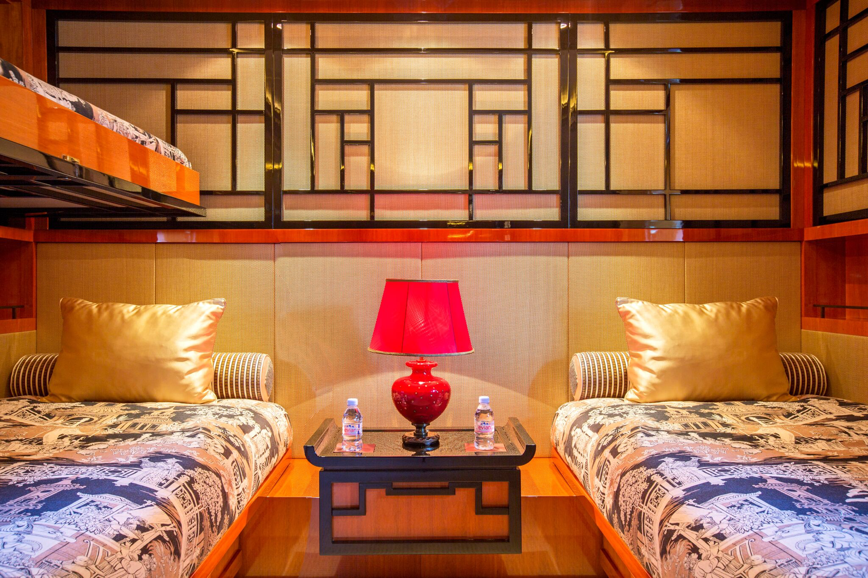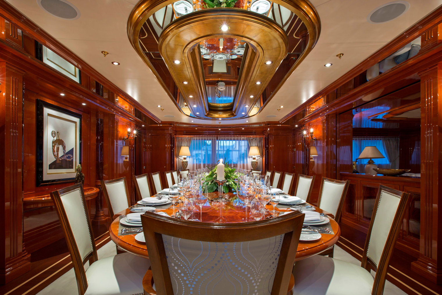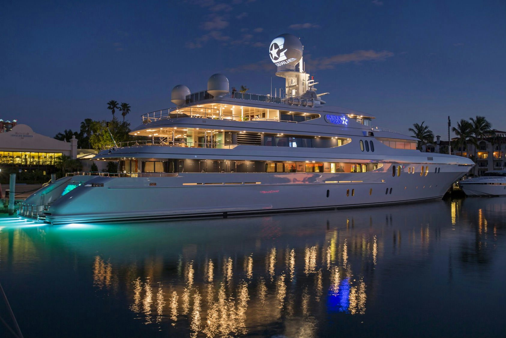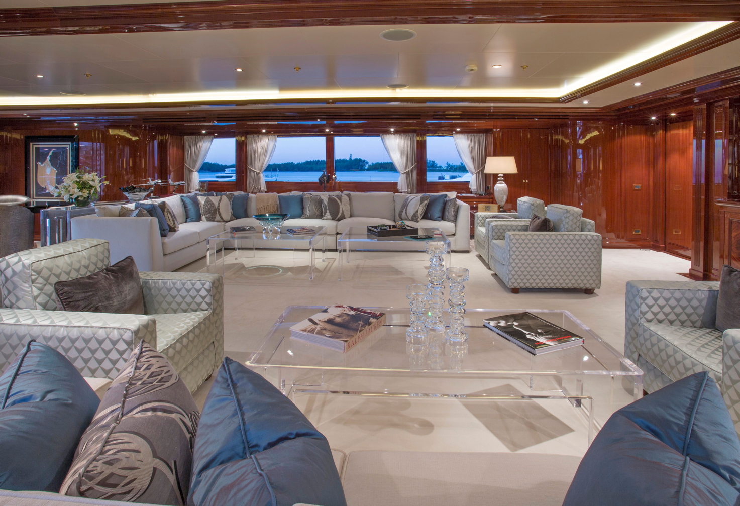 This chicly sophisticated motor yacht is outfitted to the nth degree, offering everything from innovative bi-fold sliding doors for the upper deck dining area and a striking glass elevator that accesses all interior decks, to any of the nine spacious and sumptuous staterooms that welcome up to 18 guests. The fully equipped gym, private cinema, grand piano salon, an eight-person Jacuzzi on the bridge deck are just a few other enticing amenities found aboard this resplendent yacht. “I chose DOUBLE DOWN because I loved the nine-cabin configuration since I have my three kids (plus their friends or significant others) and my friends on board,” said Mr. Rosatti.