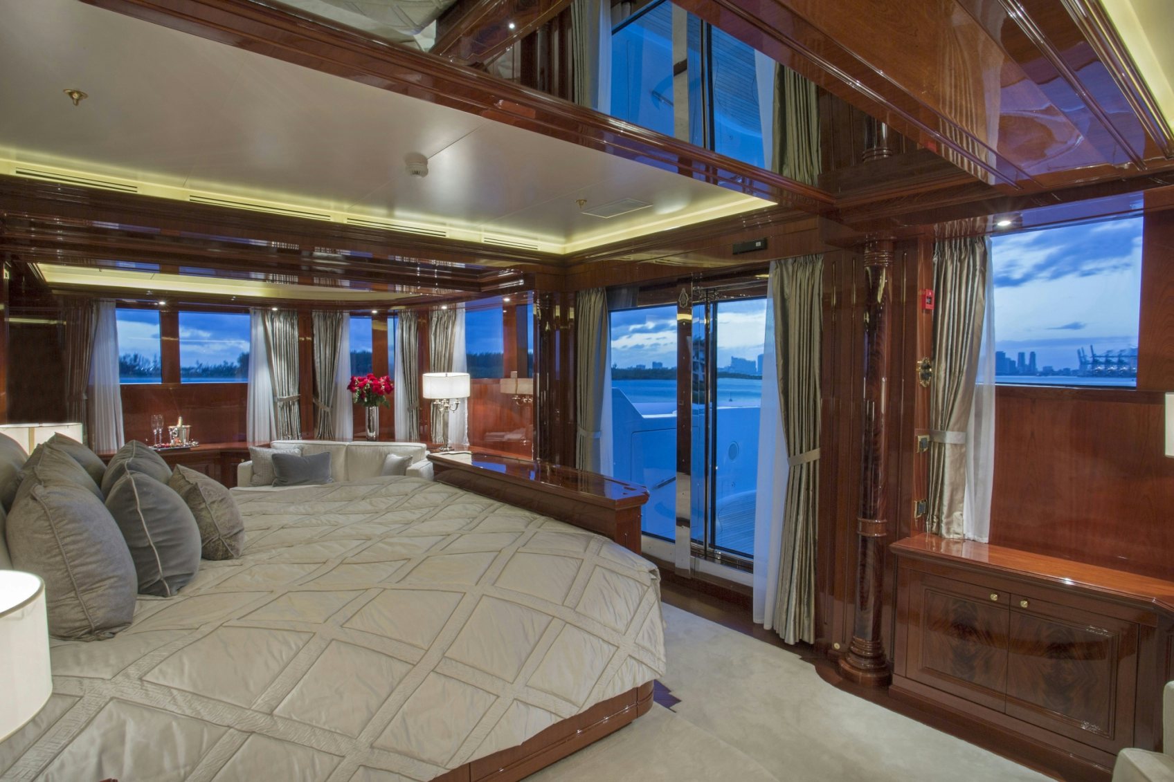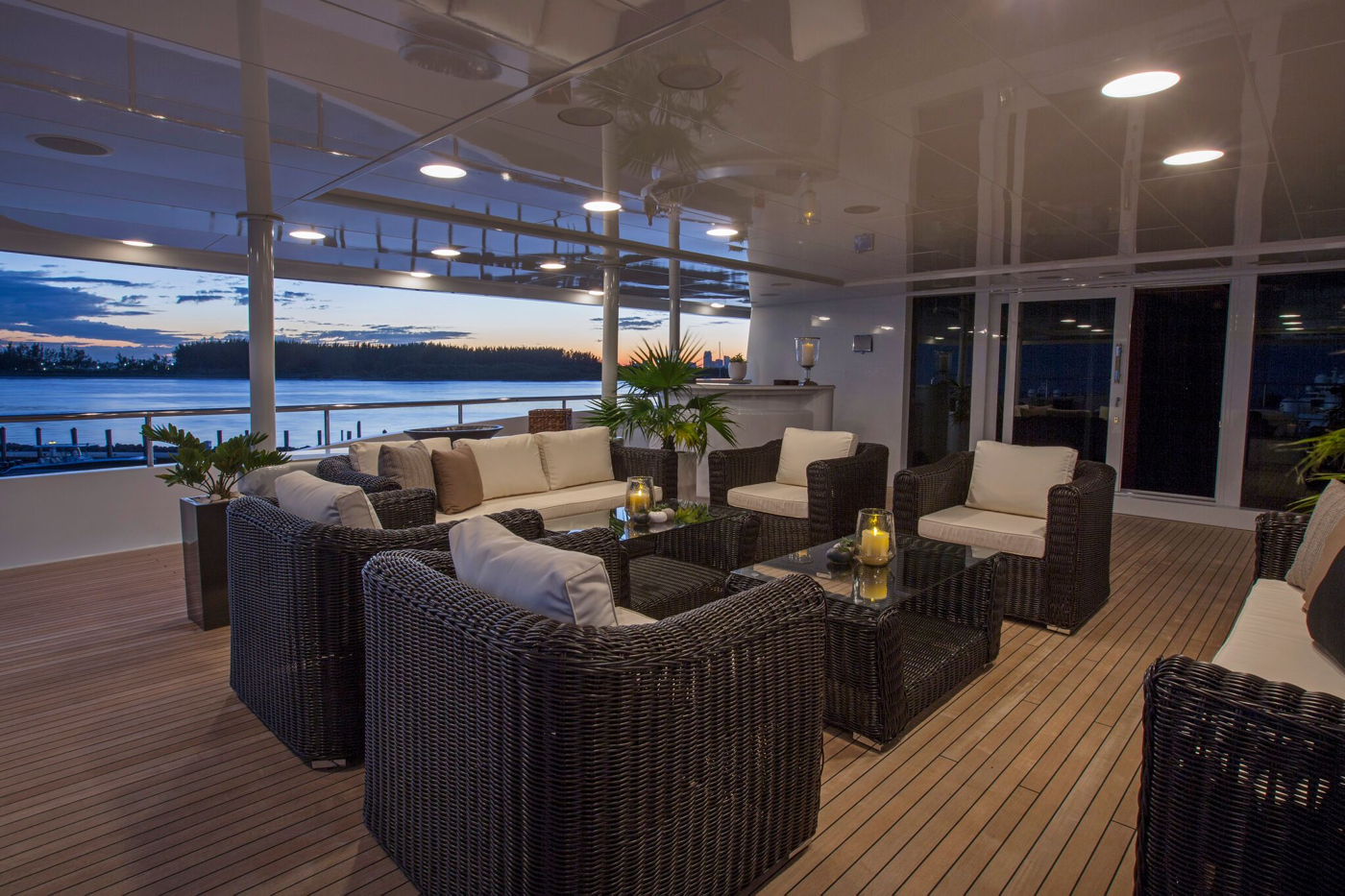 Other yachts on this owner’s resume include motor yachts THUNDERBALL and TAKE IT EASY, as well yachts from his own brand, Millennium, of which he built, owned and used several. But back to DOUBLE DOWN, Mr. Rosatti continued, “I fell in love with the owner’s deck and the aft glass convertible dining area that can be opened or closed based on the weather, offering panoramic views that are unobstructed and endless. Lastly, I also love the large glass “OTIS” elevator, which is beautiful!”
