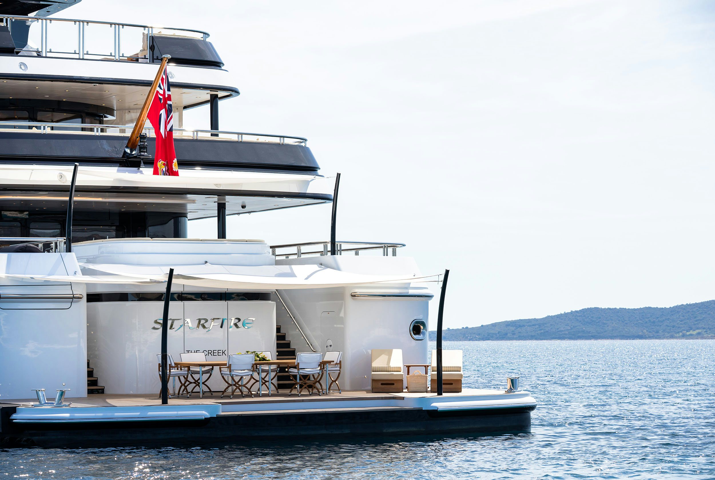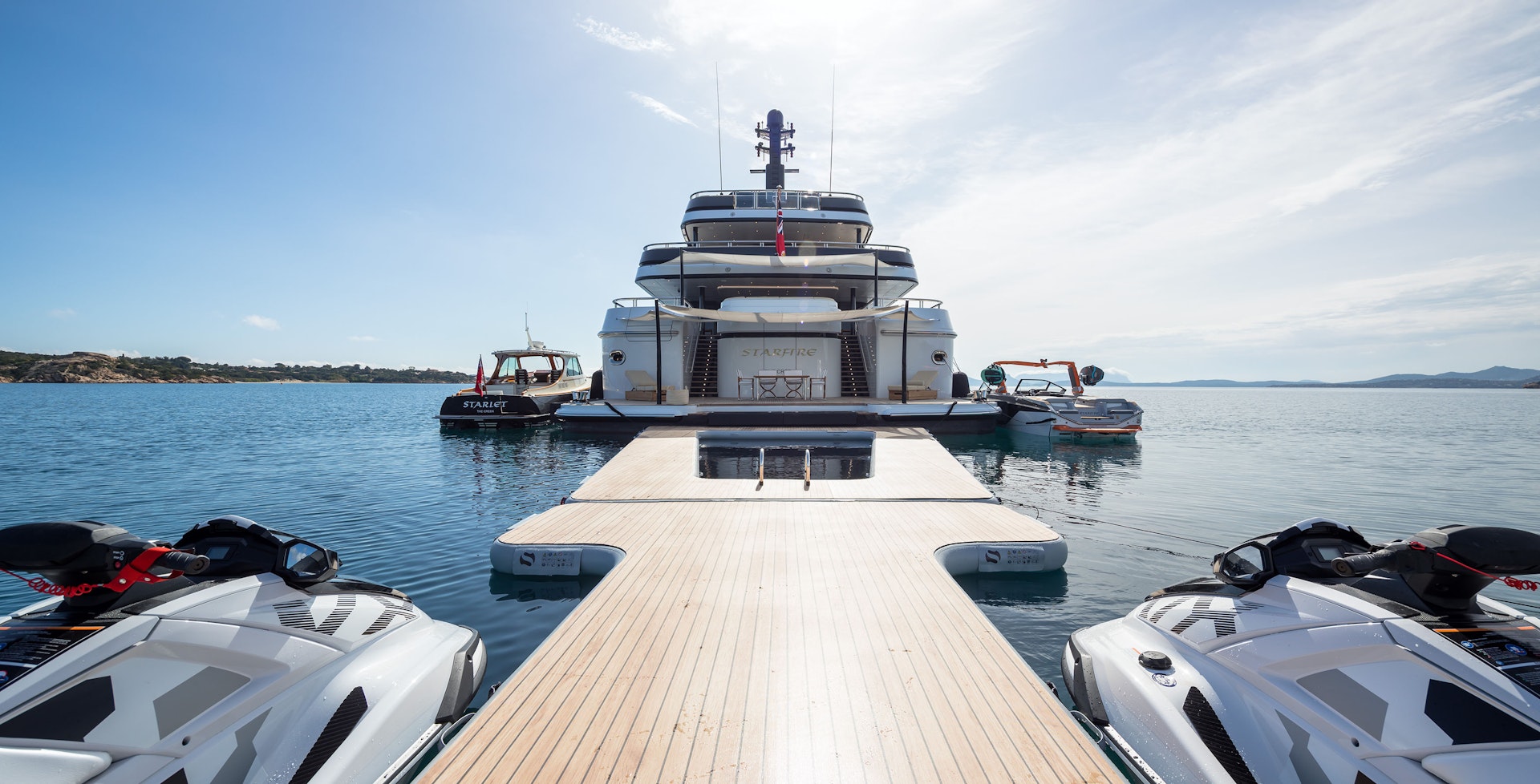 By mid-morning, attention turns toward the water. Thanks to STARFIRE’s extended stern, the yacht opens directly onto an enormous full-beam swim platform, a true waterside retreat. As a qualified dive center with all equipment onboard and two certified dive instructors, simply step off the platform and into another world to explore what lies beneath the surface.