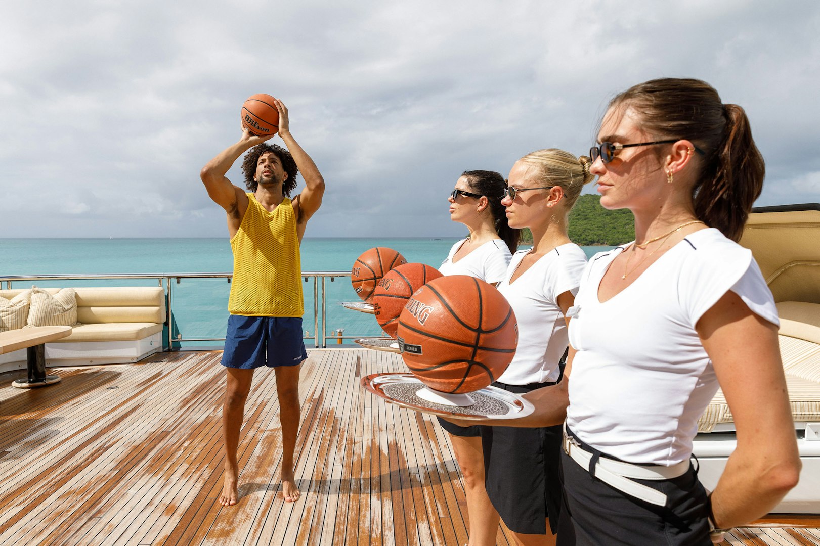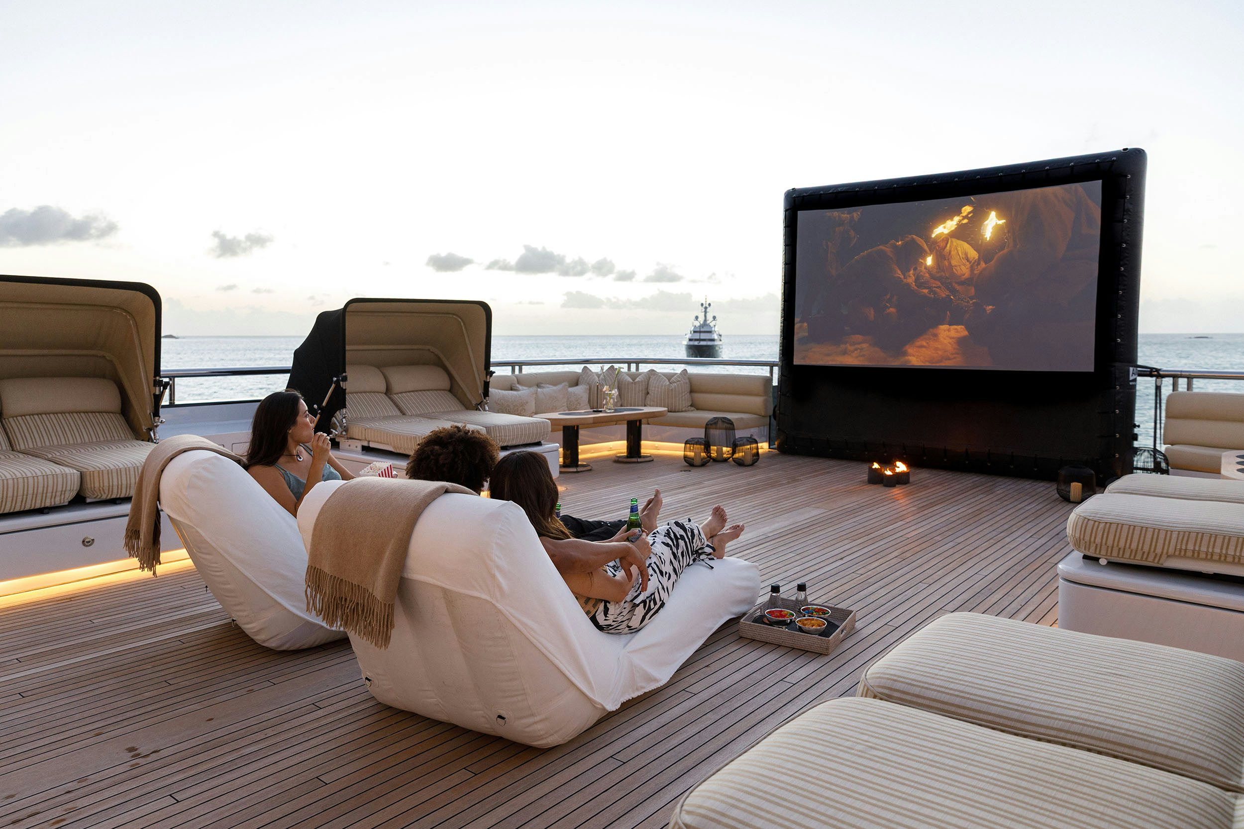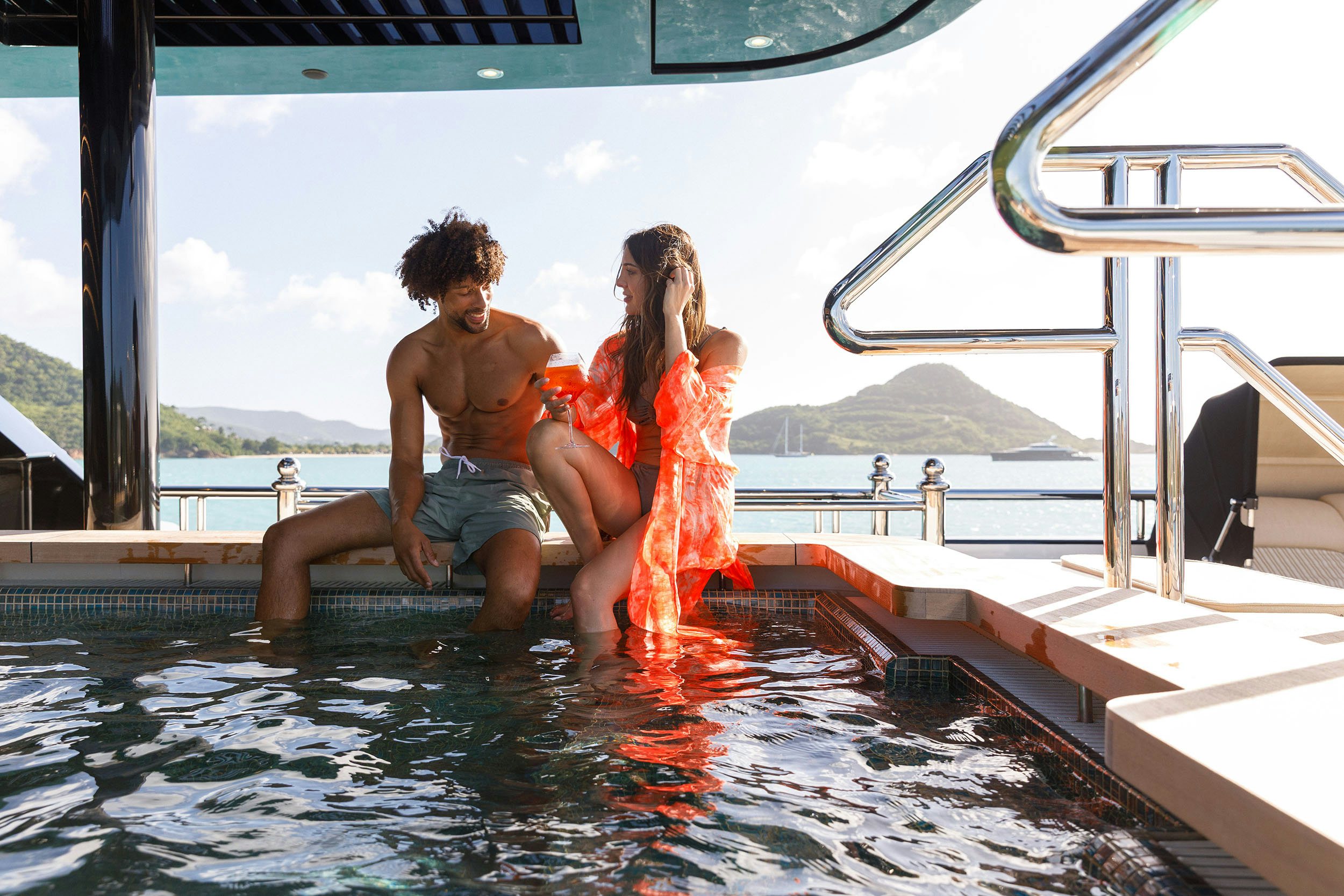 Afternoons onboard STARFIRE can unfold in countless ways. You may gravitate toward the yacht’s playful side, settling into the English pub to play poker, throw darts, enjoy burgers and beers, or challenge the other guests in the enclosed video arcade. Others head up to the sundeck, where a basketball hoop and deck area invite friendly competition before cooling off in the swimming pool. With countercurrent capability, you can swim laps before easing over to the swim-up bar. As the afternoon drifts toward golden hour, the mood shifts. The grill comes alive as Chef Thean Labuschagne steps into his element, tossing tomahawks on the grill, adding precision to something far more memorable than a typical barbecue.