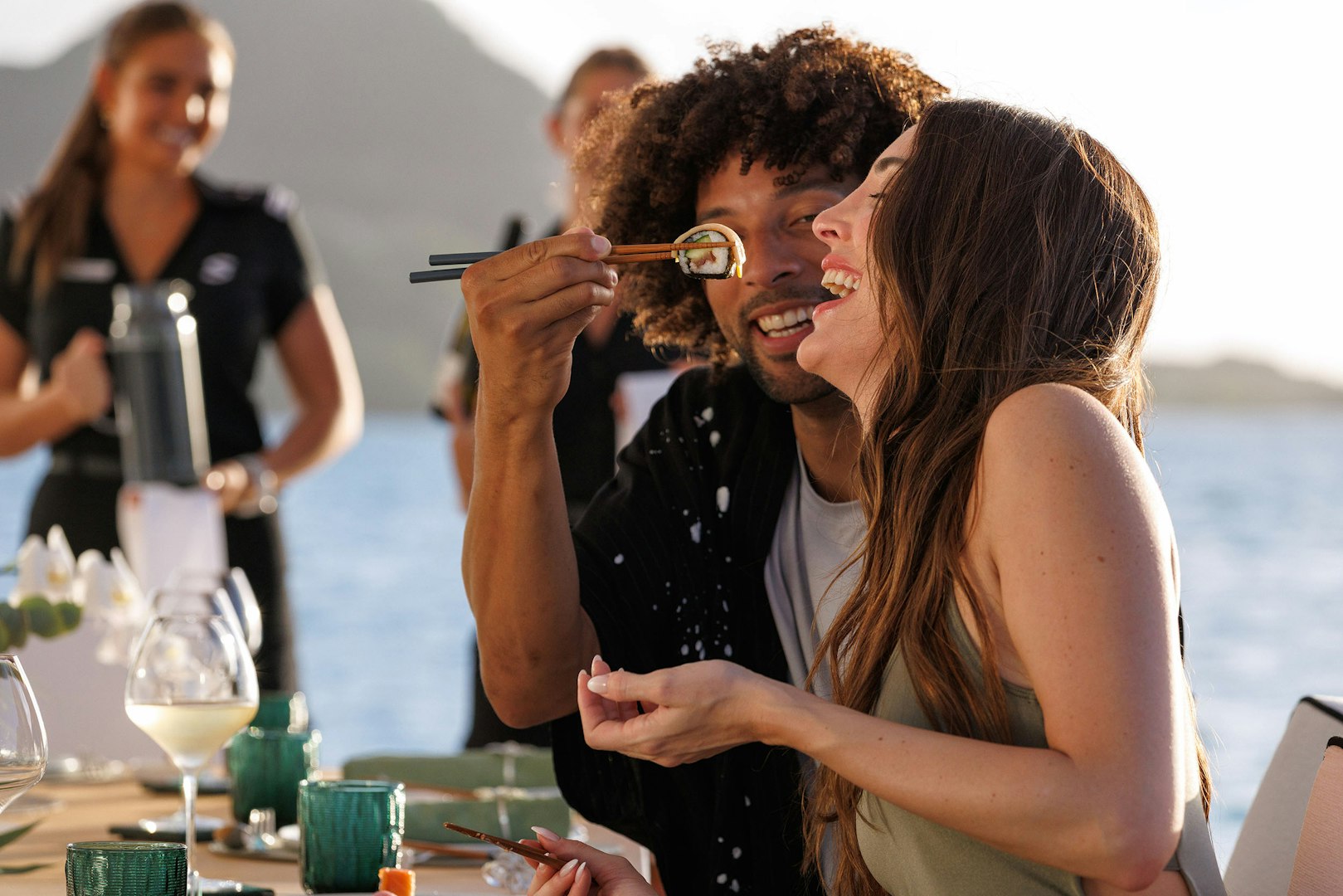 Lunch unfolds right at the water’s edge on the swim platform, where you and up to 16 guests can dine alfresco, shaded by state-of-the-art awnings. This is where STARFIRE’s culinary program really begins to shine; it’s relaxed, generous, and deeply personal. The experience is led by Chef Thean Labuschagne, whose cooking earned him 1st Place for Best Chef in the 2025 Antigua Charter Show competition.