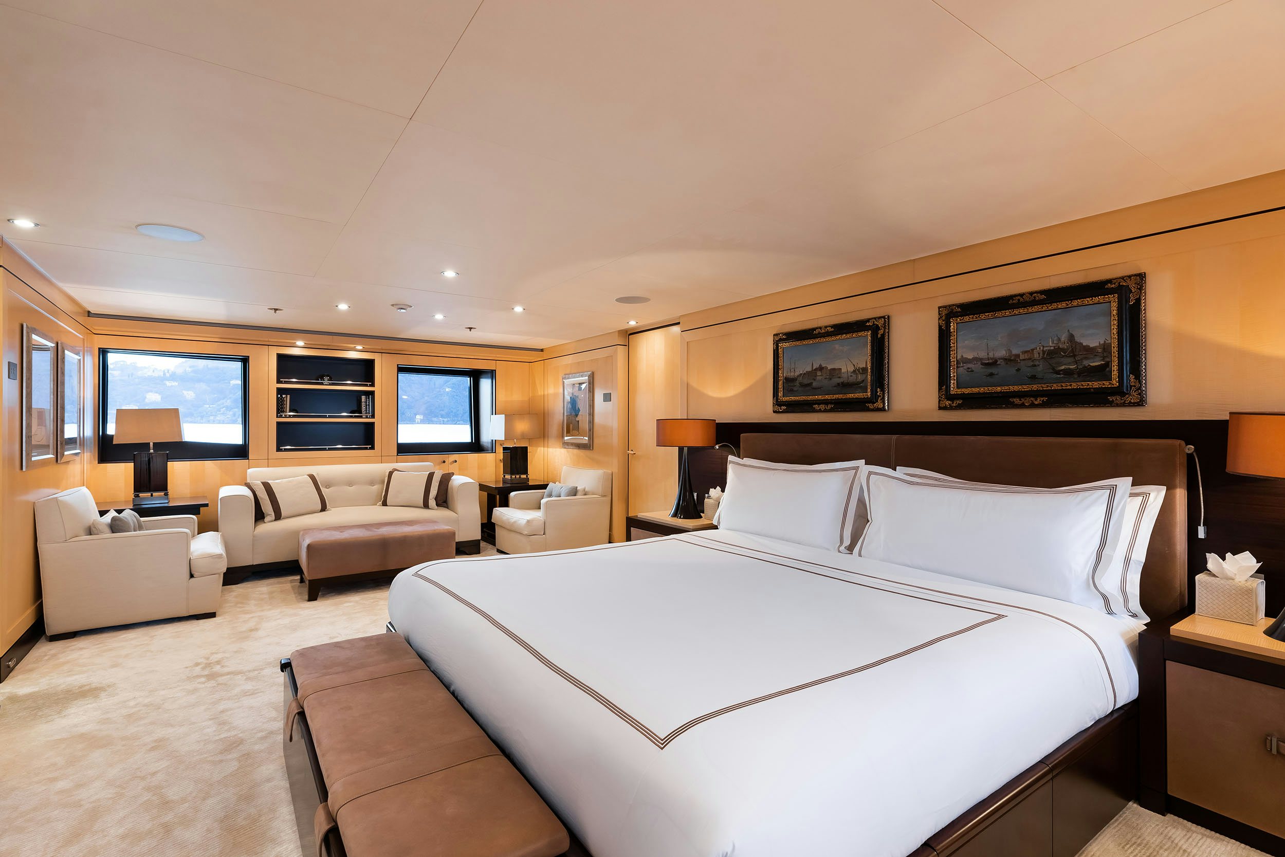 REVELRY, for example, offers the principal charterer a master stateroom on the main deck with a twin cabin located behind, which is ideally suited for small children. The lower deck is home to the yacht’s remaining four staterooms, comprising two twins and two doubles, making her layout ideal for multigenerational family charters.