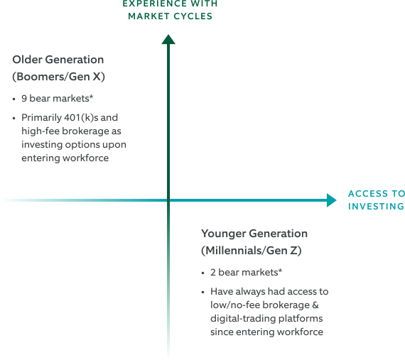 * Reflects the number of times the S&P 500 fell by more than 20% during the time these generations were of working age. Assumes Boomers started entering the workforce in 1962, Gen X in 1986, Millennials in 2003 and Gen Z in 2016.