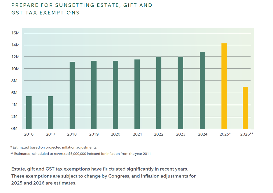 In uncertain times, it is far better to assess the current landscape and make informed decisions within the construct of a flexible plan than attempt to anticipate how and when Congress will change tax law. Of paramount importance to planning is the sunsetting provision in the estate, gift and GST tax exemption amounts. These exemptions have recently been at an all-time high but, barring action by Congress, are scheduled to revert to pre-2017 levels at the end of 2025.