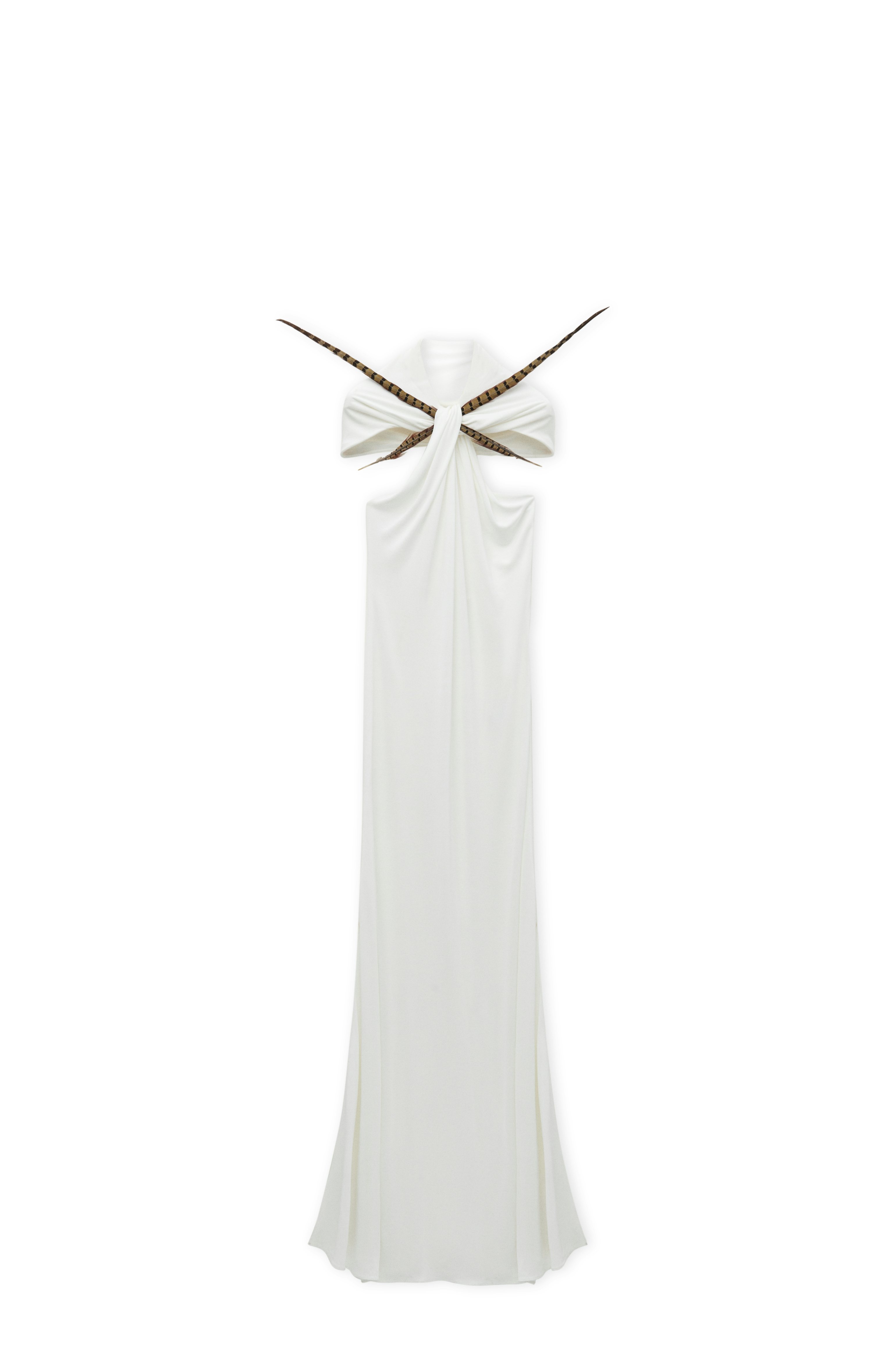 A showstopping silhouette from Loewe, this flowing maxi dress is adorned with delicate feather accents, fusing drama and elegance in a lightweight, modern design.