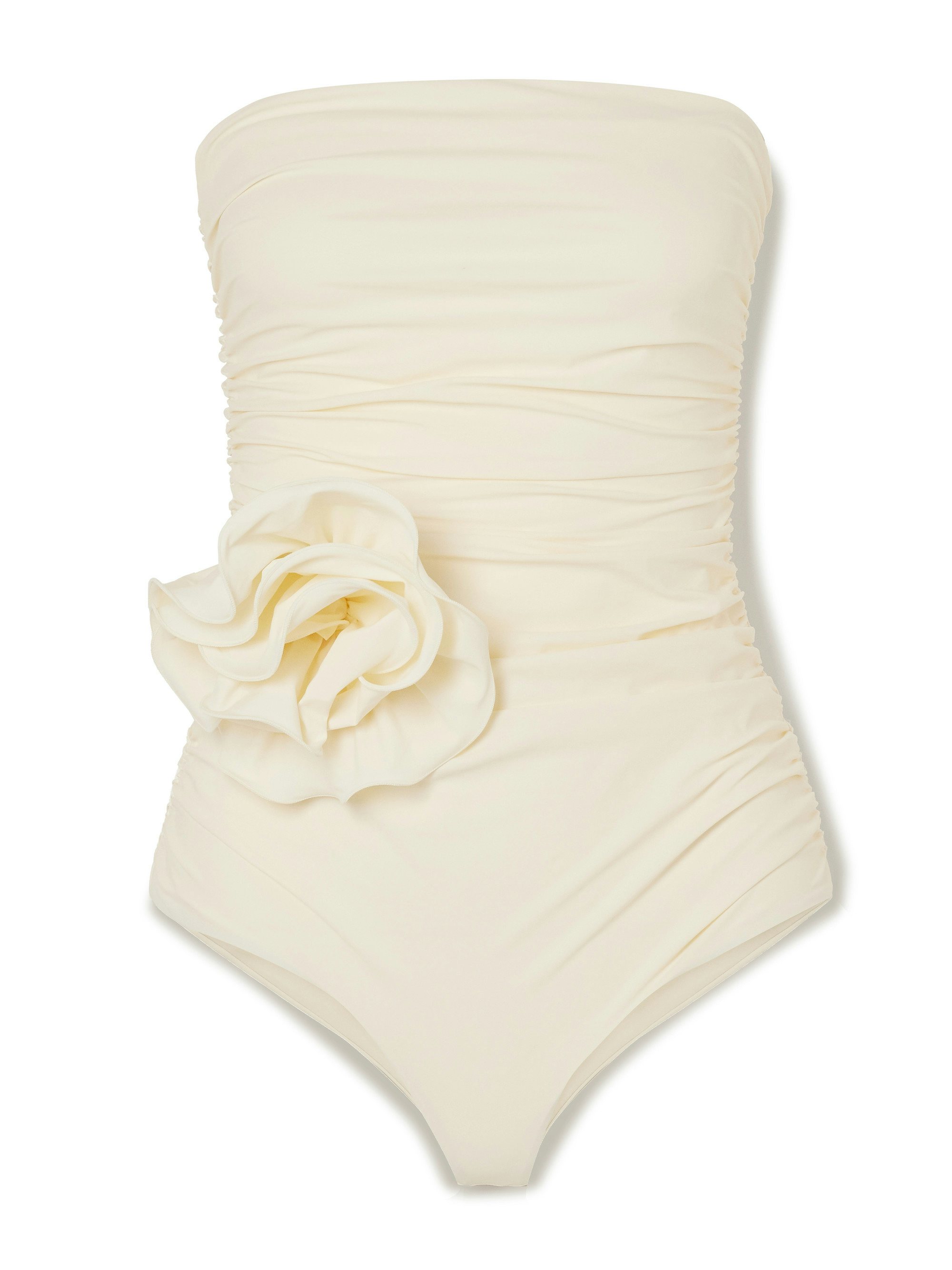 This ultra-feminine one-piece features strategic ruching and a flattering silhouette, combining retro glamour with contemporary polish.