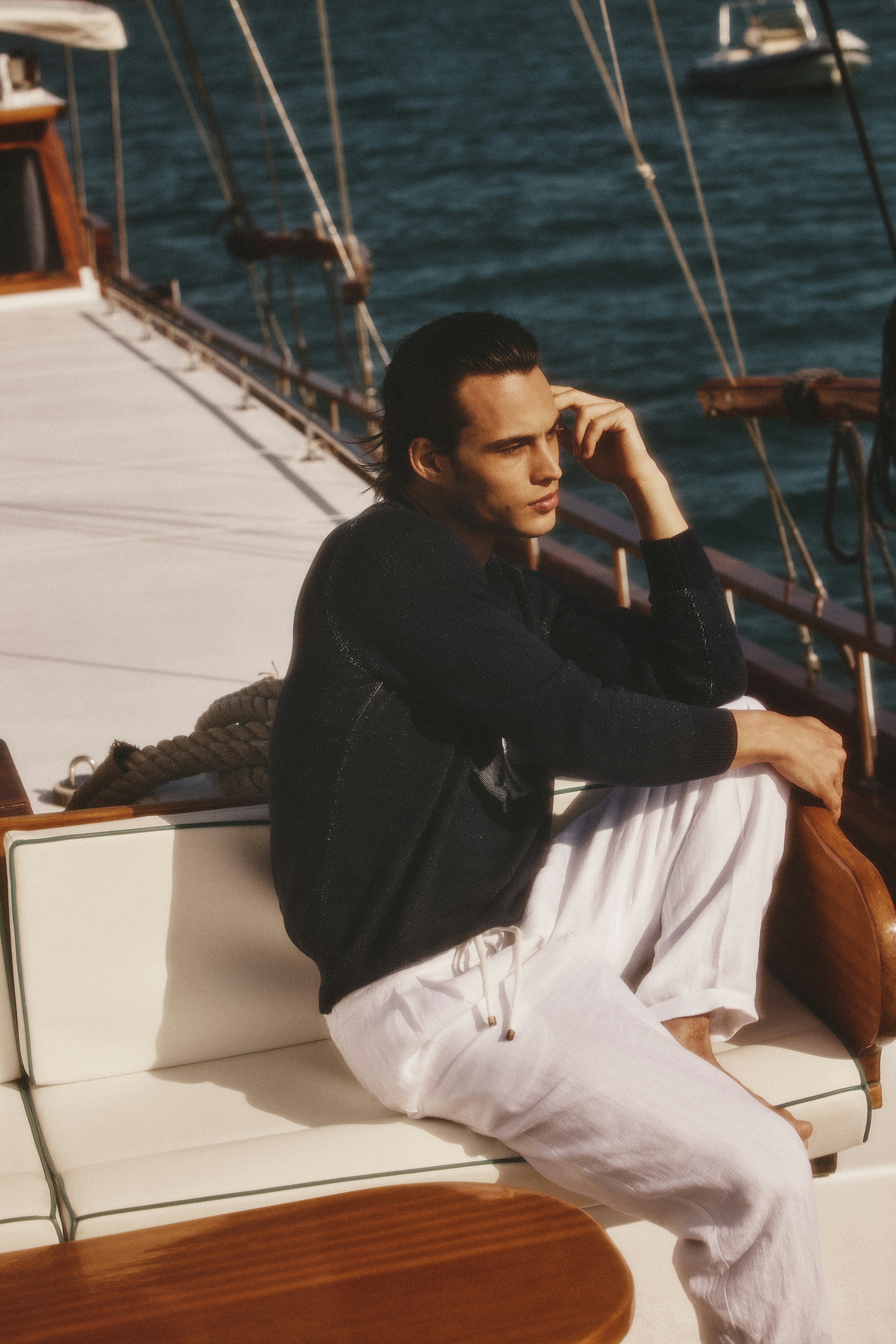 Italian refinement at its most relaxed. This soft Vanisé sweater pairs effortlessly with double-pleated leisure trousers, blending tailored precision with laid-back elegance. Perfect for mornings on deck or aperitifs at golden hour, this ensemble is a masterclass in understated luxury.