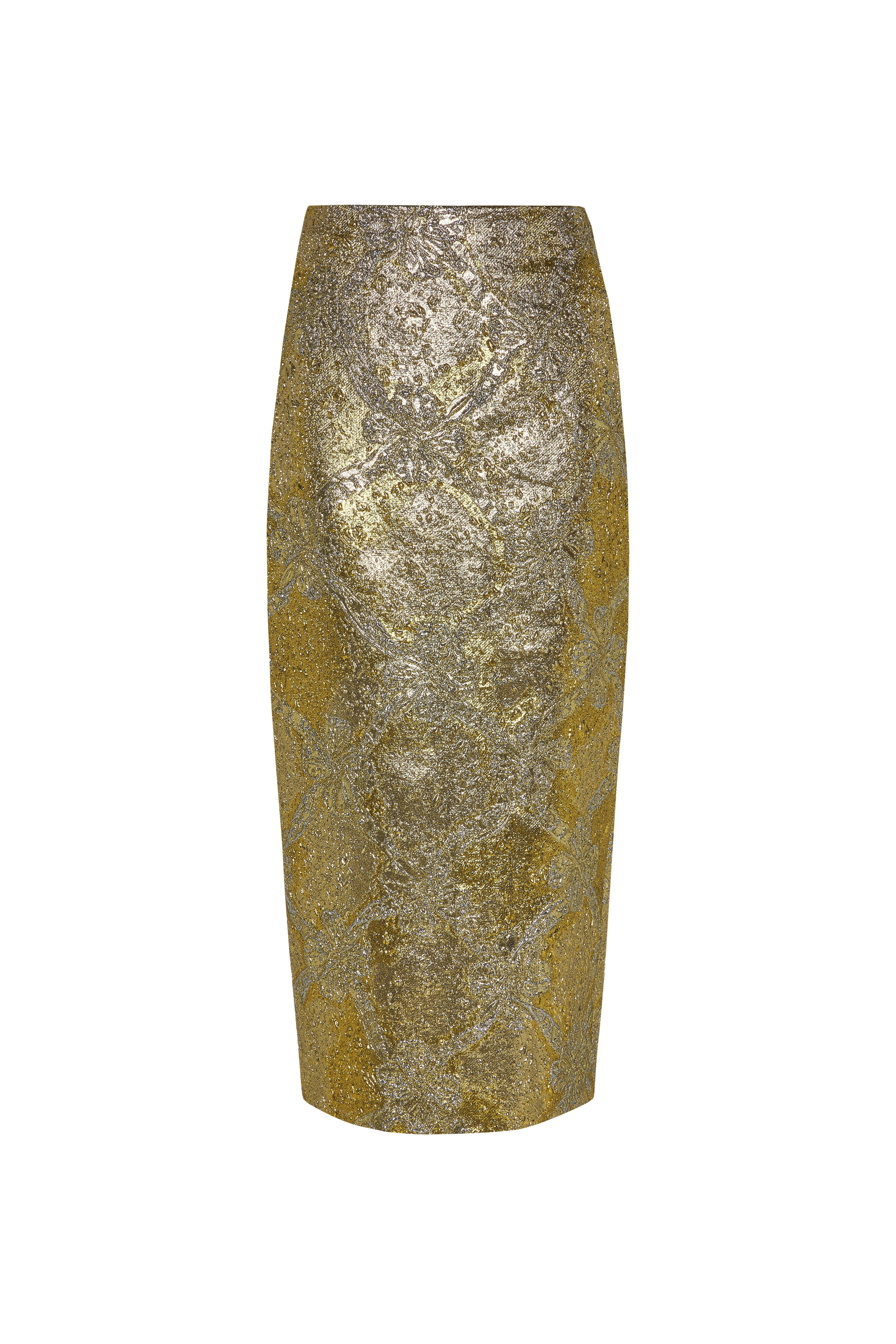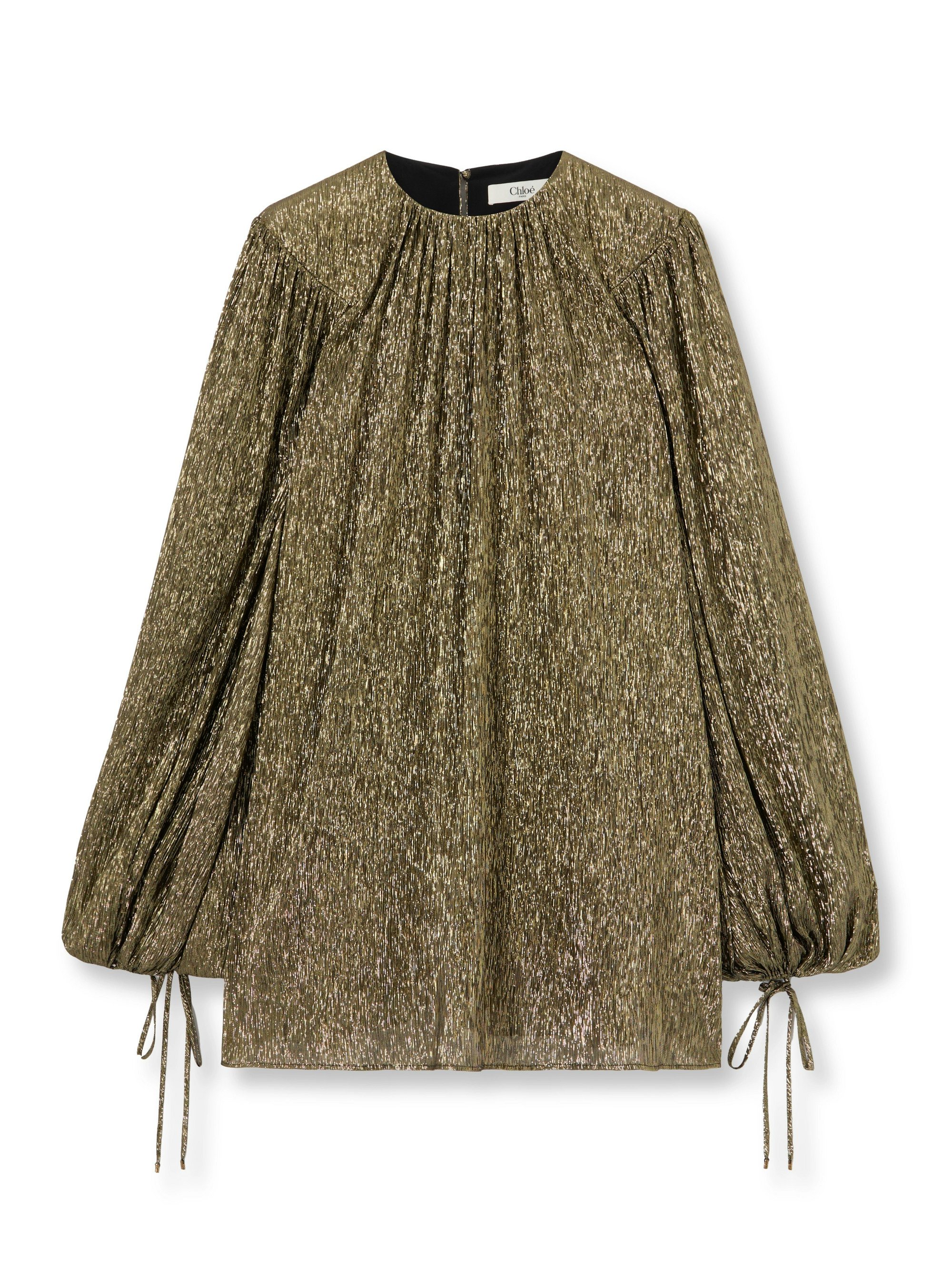 Art meets movement in this radiant metallic number, designed to dazzle from port to party.
