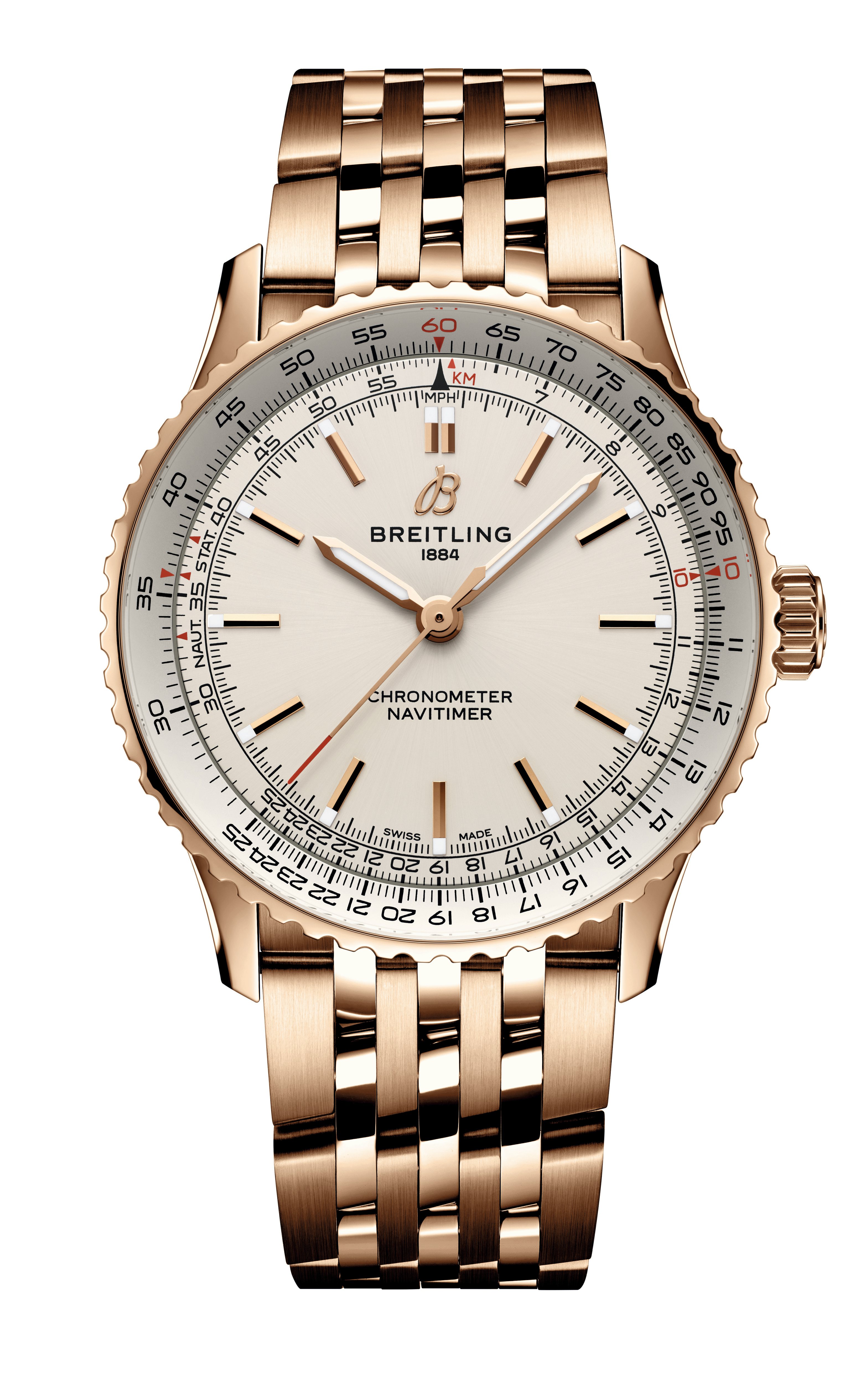 A streamlined version of Breitling’s iconic pilot’s watch, this automatic timepiece features a sleek 41mm case with the hallmark circular slide rule and aviation-inspired detailing.