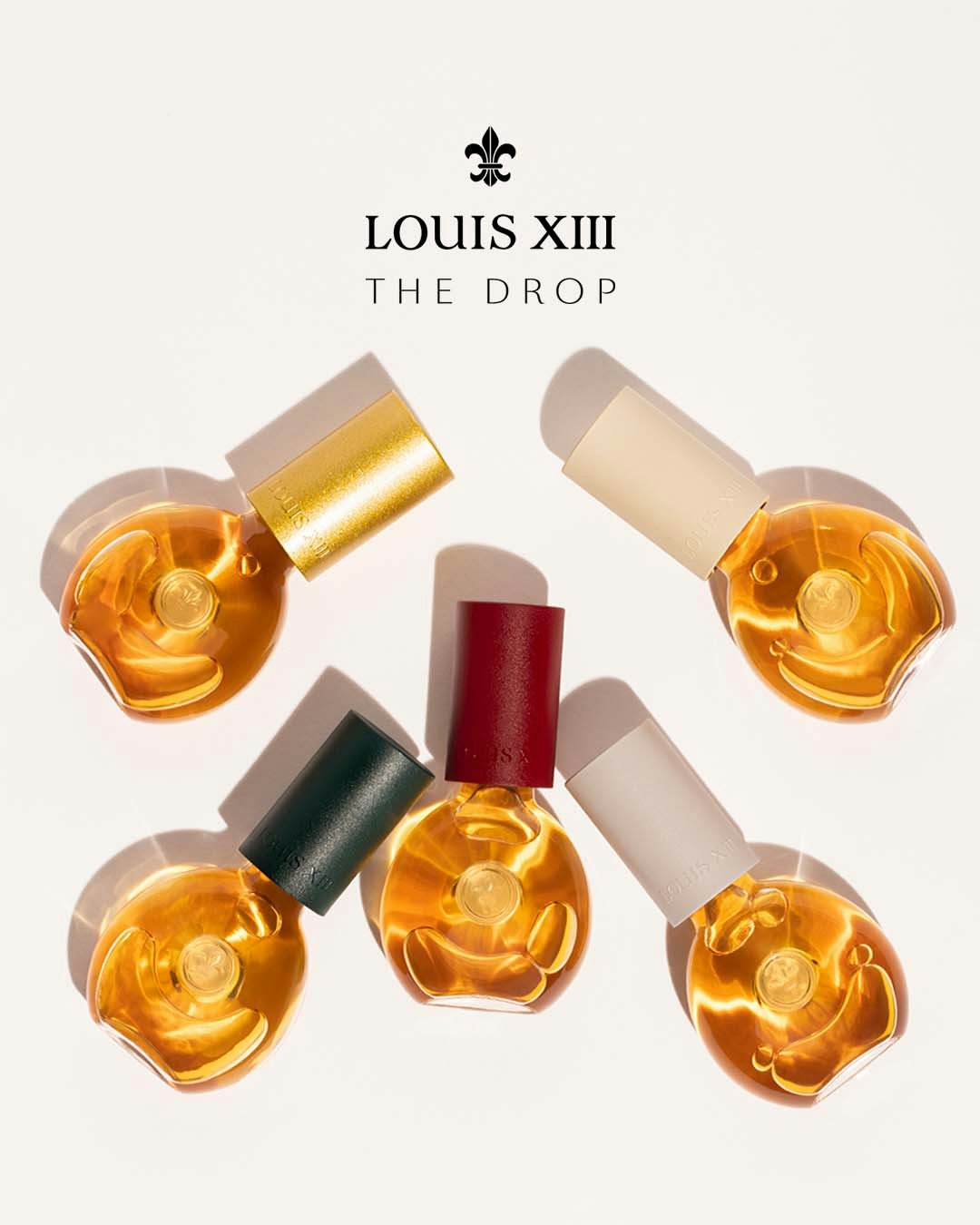 THE DROP is a collection of five 1cl glass bottles, each representing a state of mind: Make it Bold, Make it Bright, Make it Smooth, Make it Loud and Make it Glow. Each colored cap embodies key elements of the LOUIS XIII universe: clay and sand colors for the chalk and clay soils of the Grand Champagne region, green for the grapevine and distillation process key to cognac making, red for the iconic LOUIS XIII color and gold as a nod to the neck of the brand’s classic decanters.
