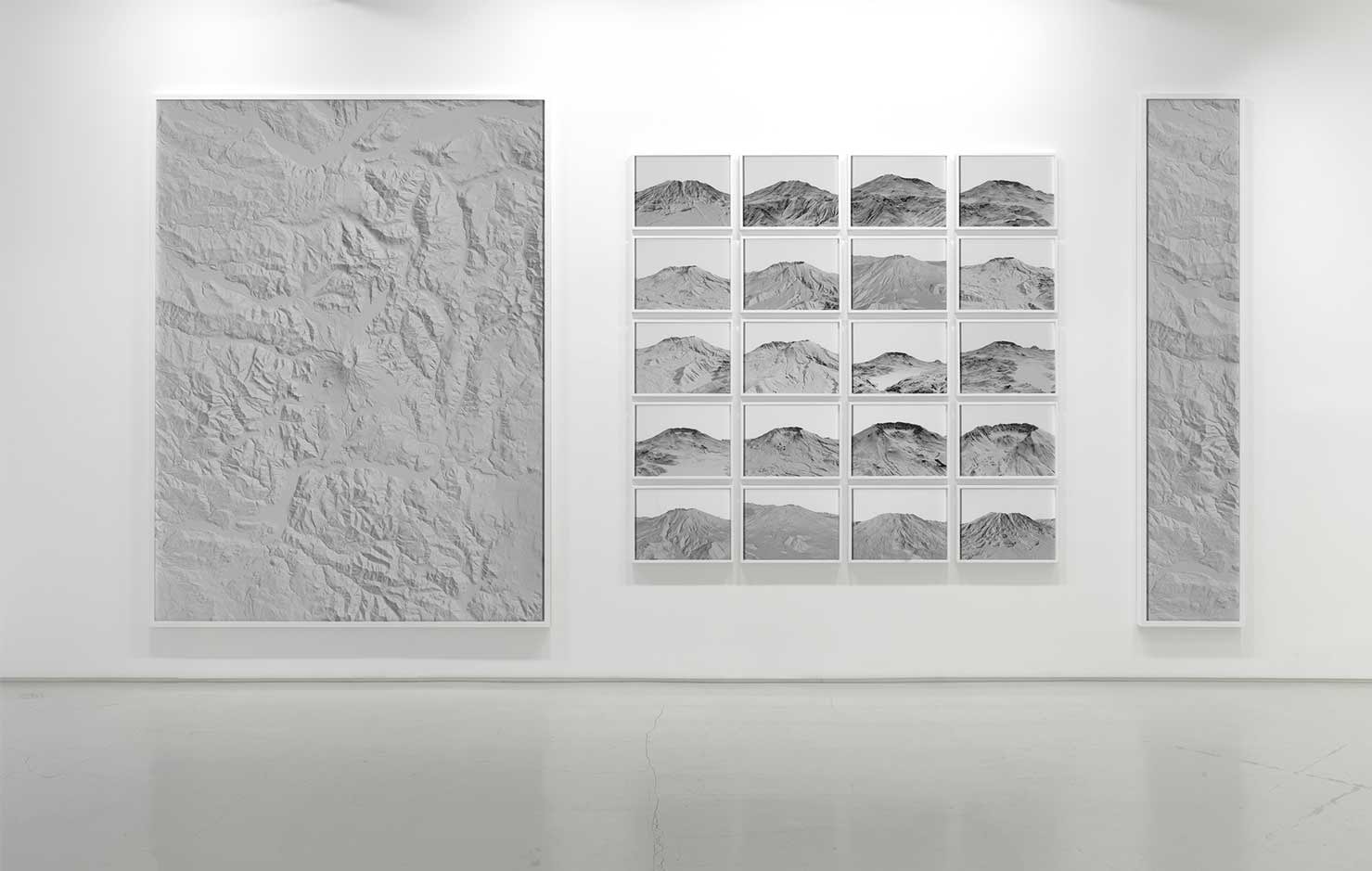 Holdsworth utilizes images of the Grand Canyon, Yosemite, Mount Shasta, Salt Lake City and Mount St. Helens from a vantage point unlike any before. The stark terrain presented offers meaning through absence. “What at first appear to be pure-white snow-capped mountains or perhaps the surface of the moon is, in fact, digitally rendered laser scans of the earth appropriated from U.S. Geological Survey data. These ‘Terrain models’ are used to measure climate and land change – to measure the earth and man’s effect upon it. Stripped of surface detail, there are no signifiers of natural wilderness or picturesque aesthetic, no invoking of the Romantic Sublime,” Lewis writes. Holdsworth’s photos encourage the viewer to transcend their preconceived visions of these locations and look at them through perhaps otherworldly eyes.