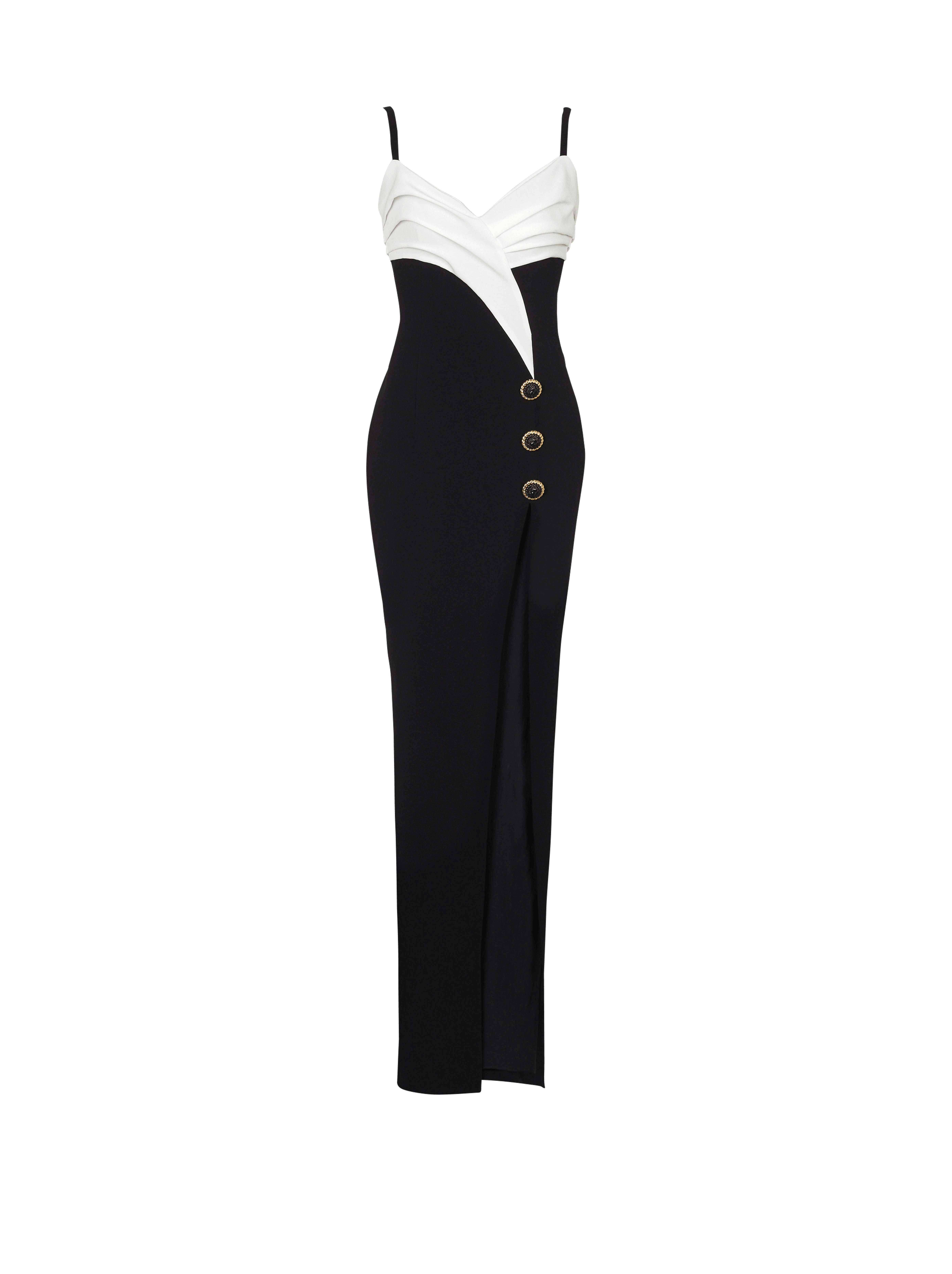 The long crepe dress from Balmain combines classic black and white in a striking two-tone design. Its elegant silhouette is both modern and timeless, creating a show-stopping look that’s perfect for a formal evening event. Pair it with statement jewelry and minimalist accessories for a refined yet eye-catching ensemble. Available at balmain.com.