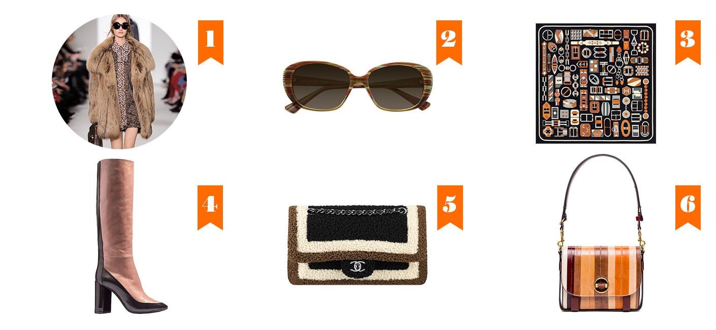 Michael Kors “Fur Look” — The Michael Kors runway look will no doubt turn a few heads when entering any room. The fox fur ensemble was sent down the runway complete with sensible heels — perfect for dancing until dawn. This full ensemble includes the Michael Kors Collection Fawn arctic fox coat, Herringbone tweed jumper, Georgette bow blouse, Laine calf pump and Tortoise sunglasses.