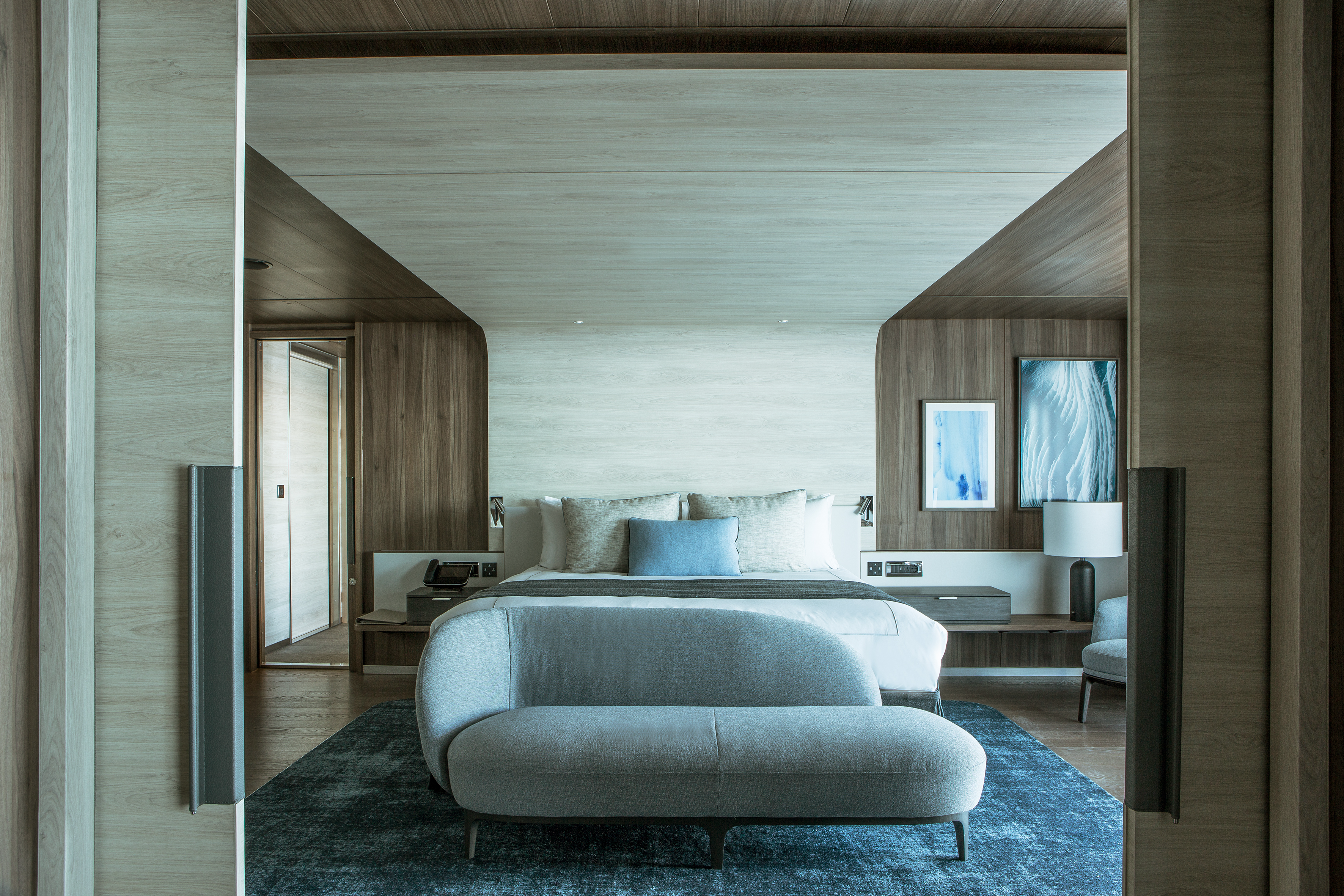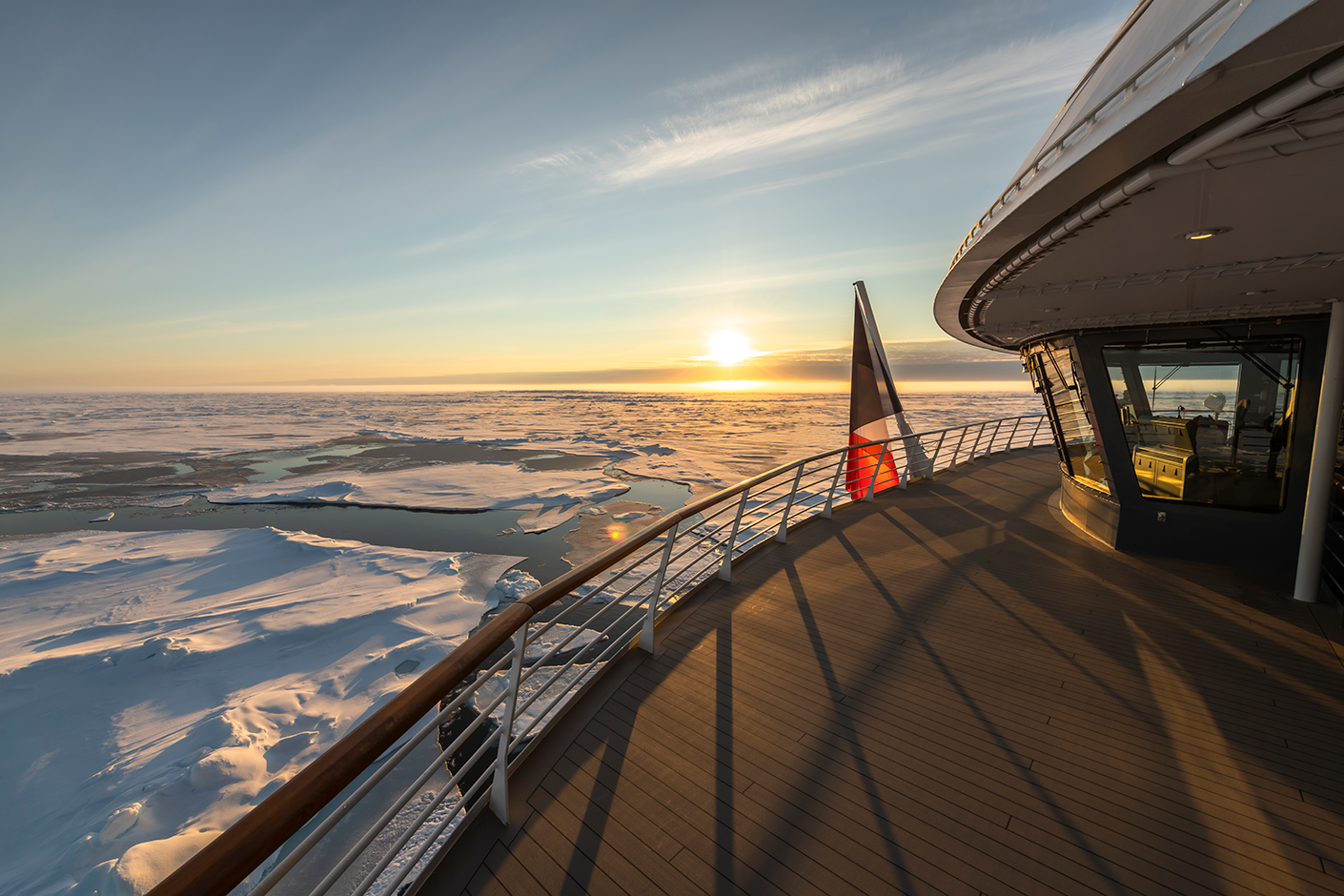 The crown jewel is undoubtedly the breathtaking Suite de l’Armateur (Ship Owner’s Suite), spanning 1,237 ft² on deck 8. This exceptional space features wide sliding glass doors that frame panoramic views of the polar wilderness, opening onto a vast 2,002 ft² private terrace—among the most extraordinary viewing platforms on any expedition vessel.