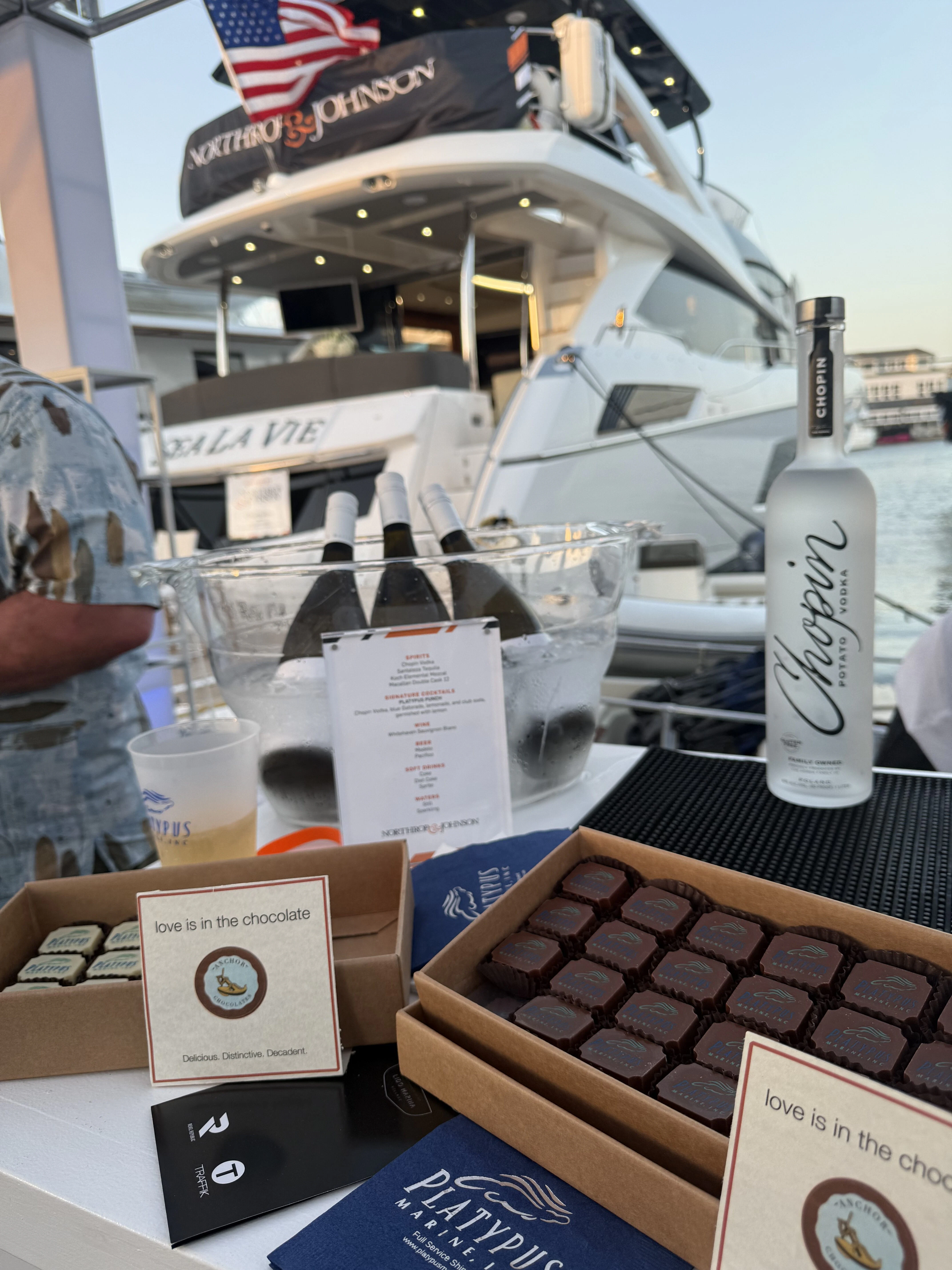 From 7 to 9:30 pm, the docks came alive as guests moved from yacht to yacht, enjoying an evening of music, cocktails, and great company. The N&J stand was buzzing, with guests dancing, drinking, and hopping from deck to deck. Highlights included Platypus’ signature “Platypus Punch” and The Macallan 12 being poured throughout the evening.