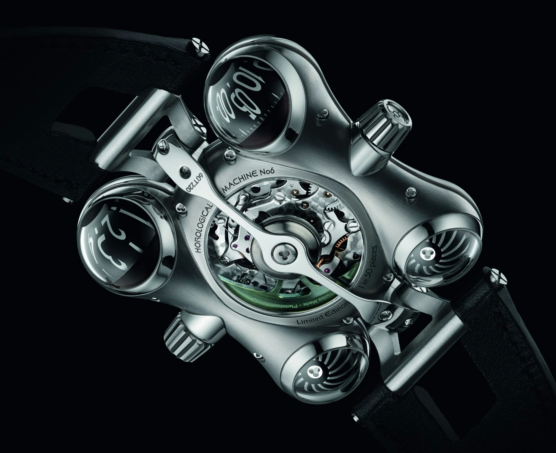 HM6 features a biomorphic case and each of the four corners house a 360° sphere with translucent sapphire crystal domes. Two semi-spherical indications rotate vertically to display hours and minutes in large legible, numerals. For power, the automatic winding rotor multiplies gearing and twin spherical turbines spin horizontally, automatically regulating the winding system in case of excessive speed to reduce stress and wear.