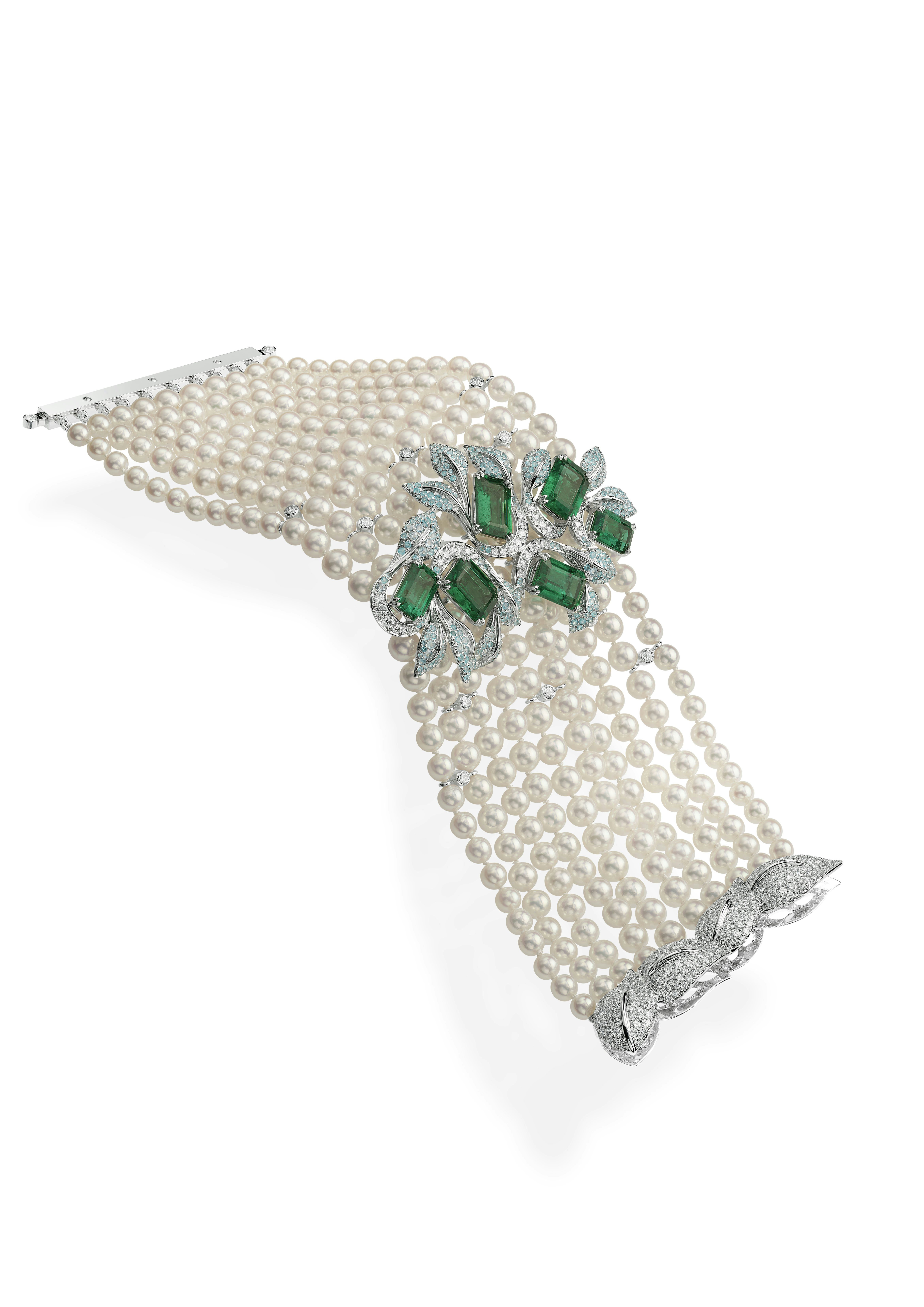 Freshly plucked from Chopard’s Insofu collection, a pearl cuff that feels less like an accessory, more like a myth. Ten strands of luminous pearls wrap the wrist, while a floral flourish in ethical 18-karat white gold anchors the piece. Set into its bloom: six emerald-cut emeralds totaling 16.58 carats and a scattering of brilliant-cut Paraiba tourmalines (2.09cts) in electric lagoon blue; and 3.52 carats of brilliant-cut diamonds. chopard.com